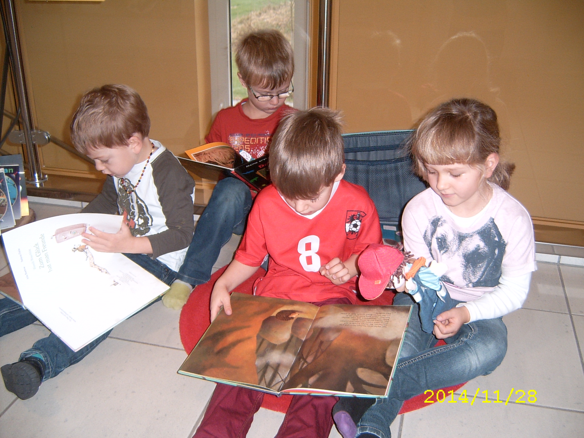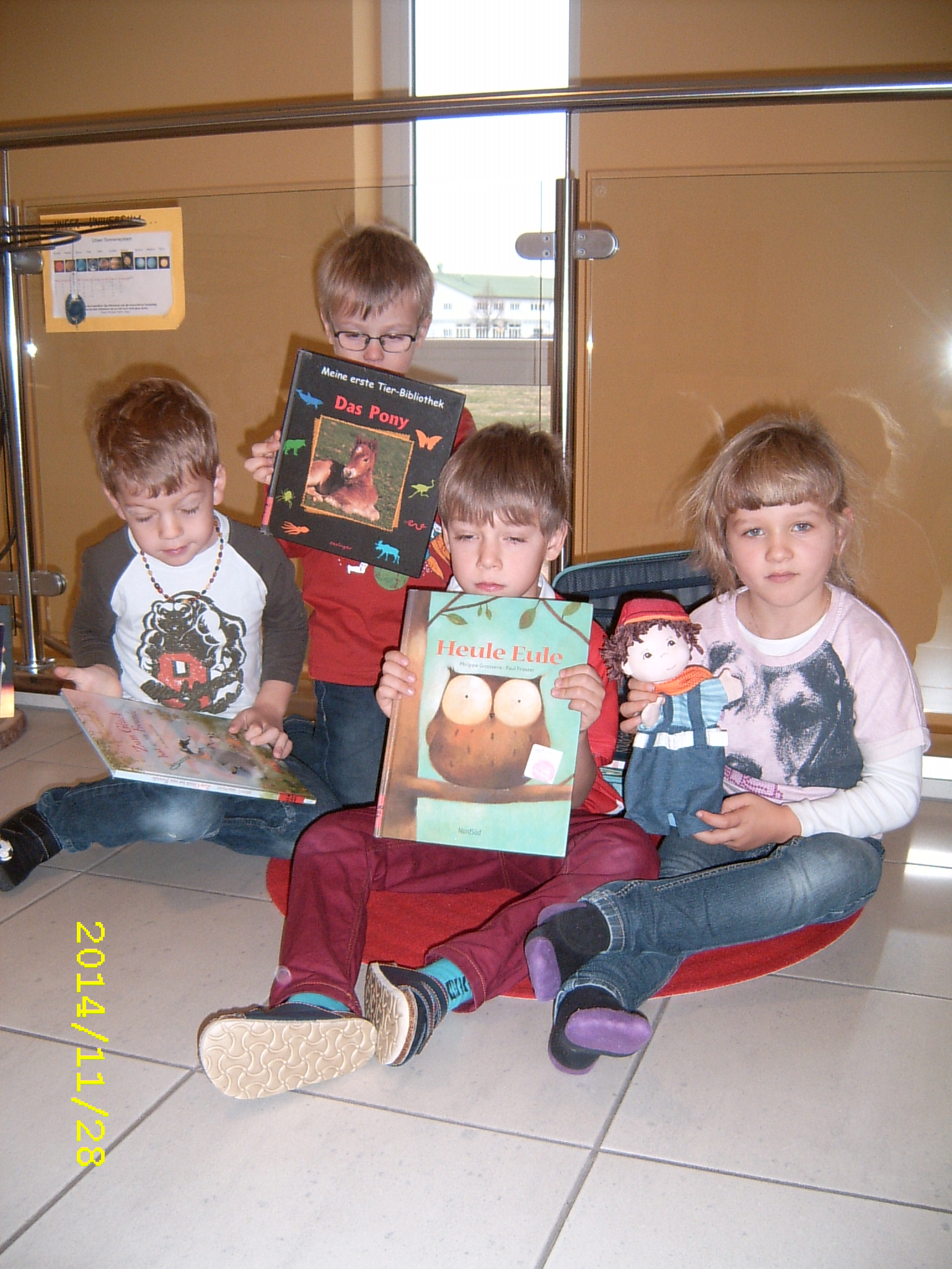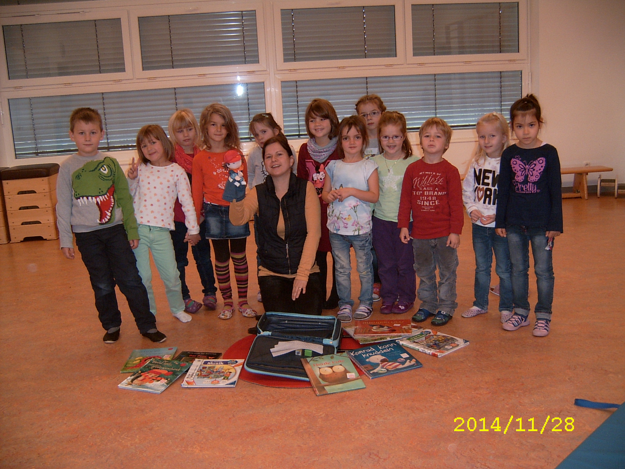 Unser neuer Mitarbeiter im Außendienst: der Bücherei-Maxi! Unser Werbeprofi hat die Schulanfänger im Kindergarten besucht und ihnen die Bücherei vorgestellt. Die Kinder fanden ihn sehr lustig. Vor allem wussten sie genau, wo der Bücherei-Maxi zu Hause ist: “ Bücherei ist da vor dem Mio – der Pizzaria.“ bzw. “ Da wo die Kirche ist.“ Mit dabei hatte er einen Koffer mit tollen Büchern, zum Beispiel das – wie der Name schon verrät – höchst unterhaltsame Buch „Hühnerlulu“. Vielen Dank an Christine Lengauer für diese tolle Aktion!