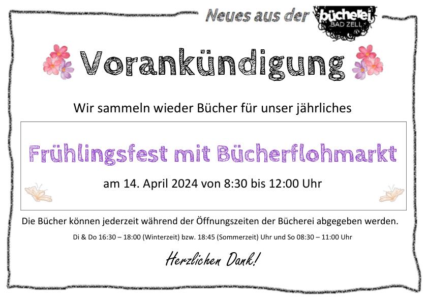Wir sind wieder auf der Suche nach Bücherspenden für unser jährliches Frühlingsfest mit Bücherflohmarkt am 14. April 2024. Bitte markiert euch diesen Termin schon einmal in eurem Kalender!