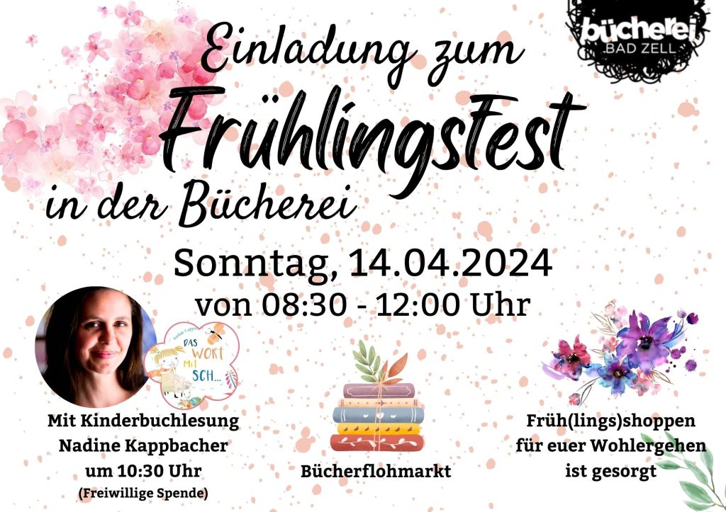 wir laden euch herzlich zu unserem Frühlingsfest in unsere Bücherei ein, das am 14. April 2024 von 08:30 – 12:00 Uhr stattfinden wird! Es erwartet euch ein Vormittag voller Freude, Literatur und Frühlingszauber für die ganze Familie.
