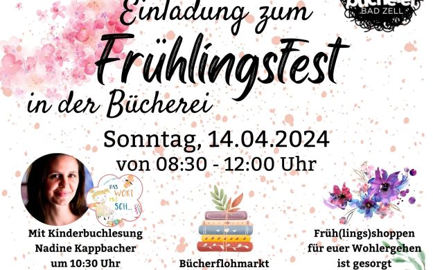 wir laden euch herzlich zu unserem Frühlingsfest in unsere Bücherei ein, das am 14. April 2024 von 08:30 – 12:00 Uhr stattfinden wird! Es erwartet euch ein Vormittag voller Freude, Literatur und Frühlingszauber für die ganze Familie.