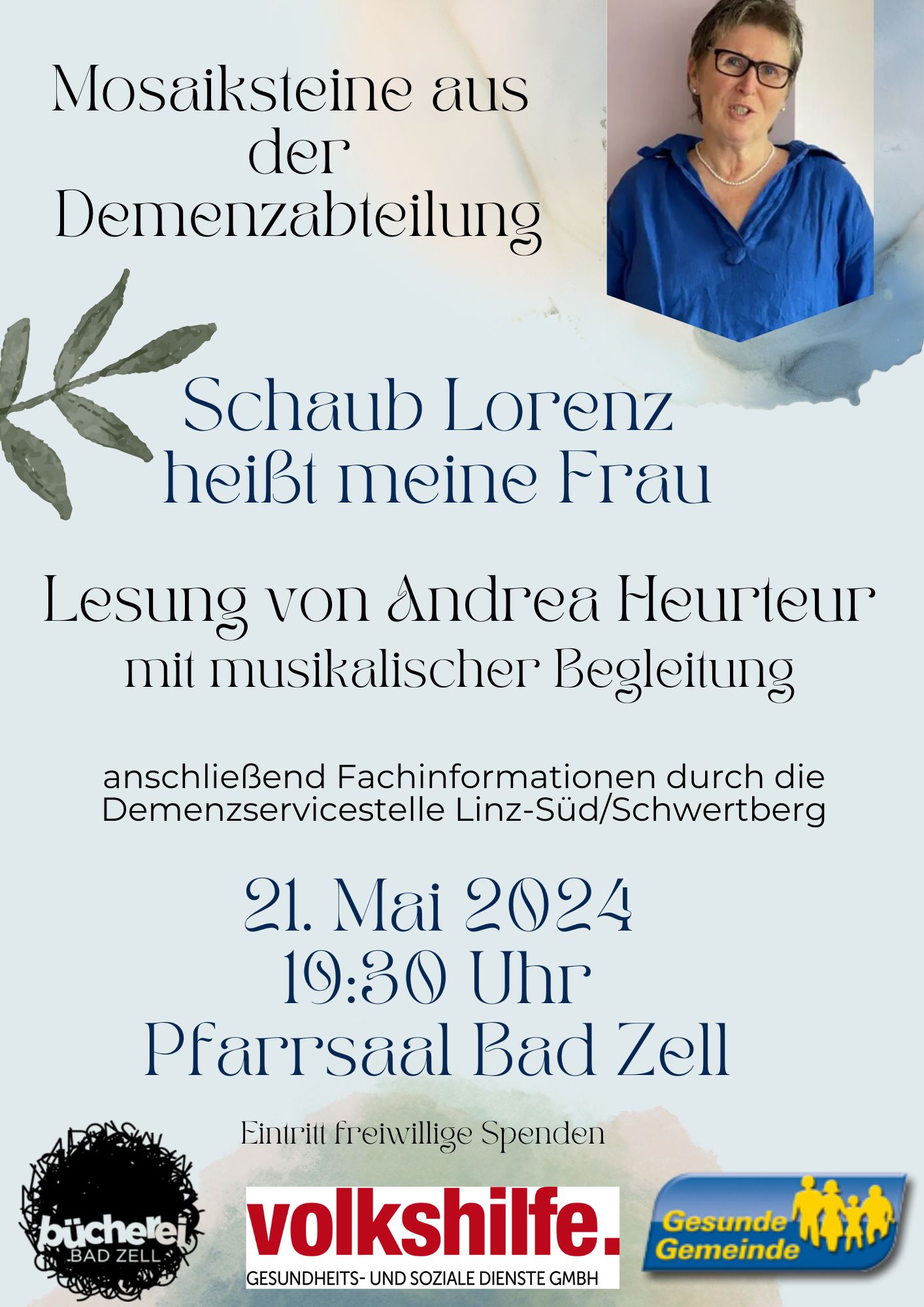 Am Dienstag den 21. Mai 2024 um 19:30 Uhr, laden wir Sie herzlich gemeinsam mit der Gesunde Gemeinde Bad Zell, zu einer ganz besonderen Lesung mit Andrea Heurteuer ein. Sie wird uns einen Einblick in das Leben einer Demenzabteilung eines Alters- und Pflegeheims in der Schweiz geben. Dort werden wir Menschen unterschiedlichen Alters und verschiedener sozialer Hintergründe kennenlernen, die trotz ihrer Vielfalt alle die Diagnose Demenz teilen.