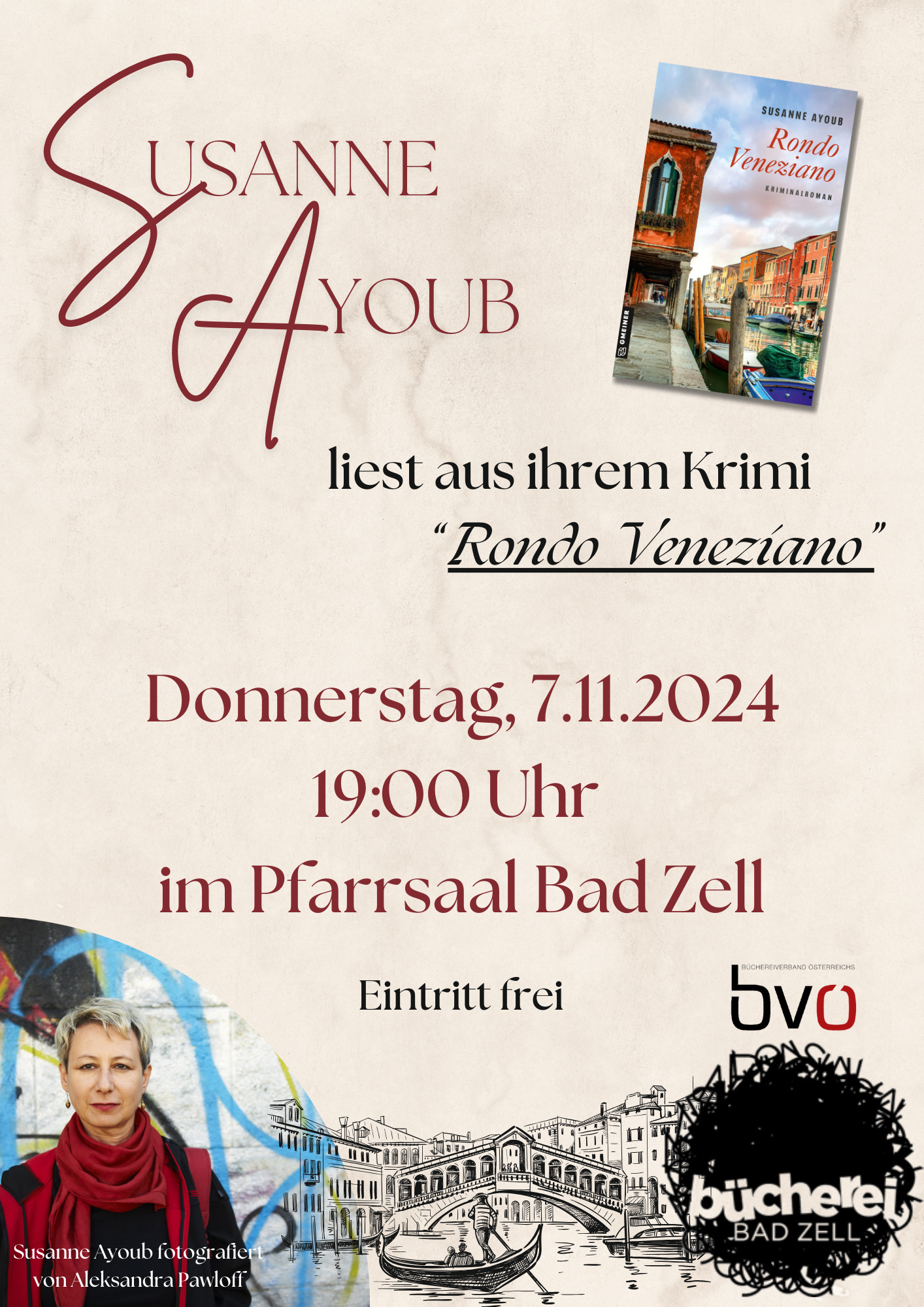 Am 7. November 2024, um 19:00 Uhr laden wir die renommierte Autorin Susanne Ayoub zu einer spannenden Lesung aus ihrem neuesten Kriminalroman „Rondo Veneziano“ ein.