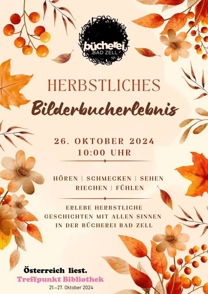 Home Am 26. Oktober laden wir wieder zum jährlichen Herbst Bilderbucherlebnis um 10:00 Uhr in der Bücherei ein. Wir freuen uns auf ganz viele Kinder die ihre Sinne austesten wollen! Ähnliche Beiträge