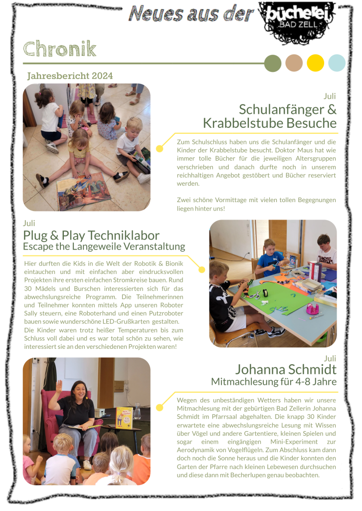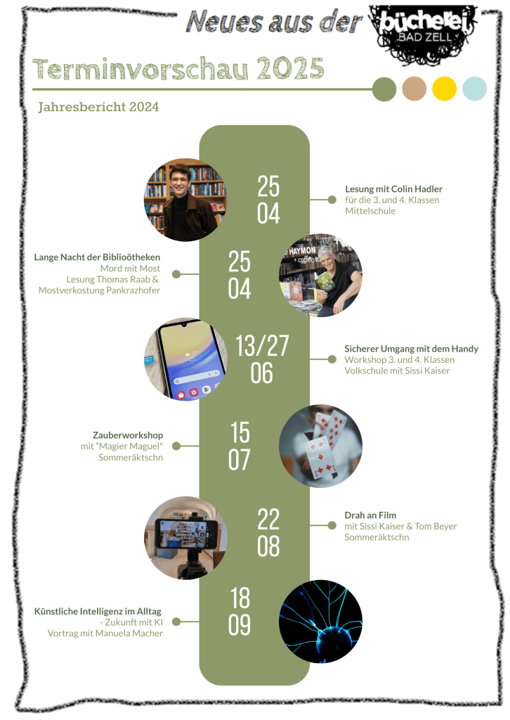 Im Jahr 2024 schaute die Büchereiwelt auf Bad Zell. Mit unserem Projekt „Escape the Langeweile – Back to Bücherei“ durften wir einen 45-minütigen Fachvortrag bei der OÖ-Bibliotheksfachmesse in Puchberg halten. Außerdem vertraten wir mit diesem Projekt unsere Bücherei zwei Tage lang in Wien beim Büchereipreis 2024 – und wurden Dritte beim Publikumsvoting!