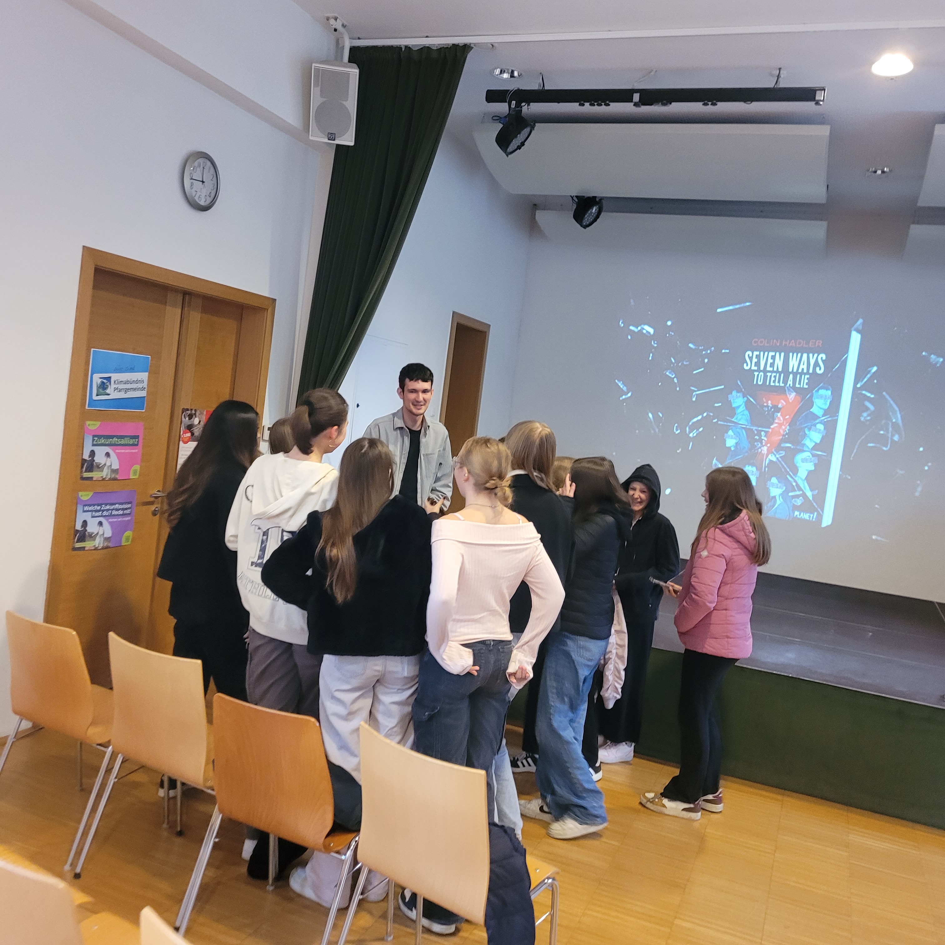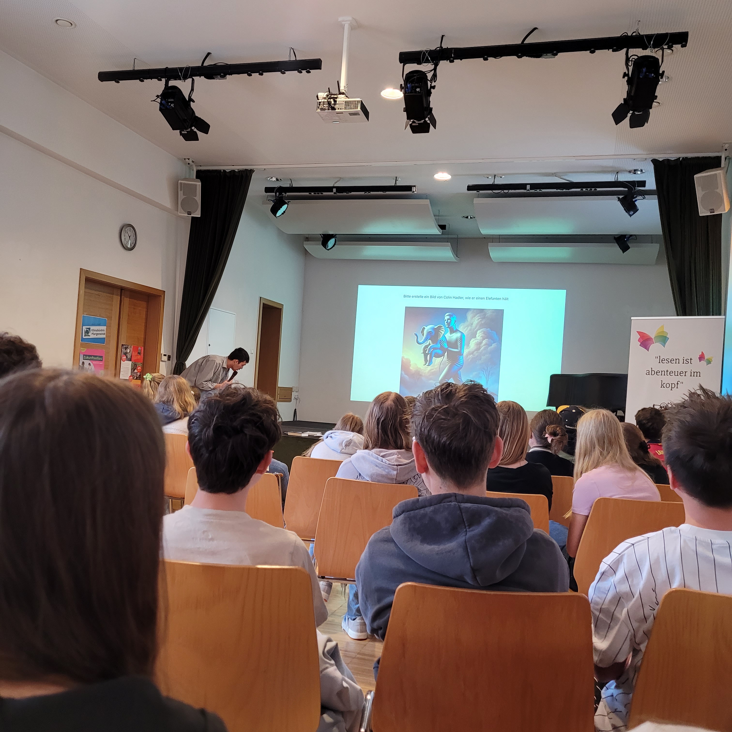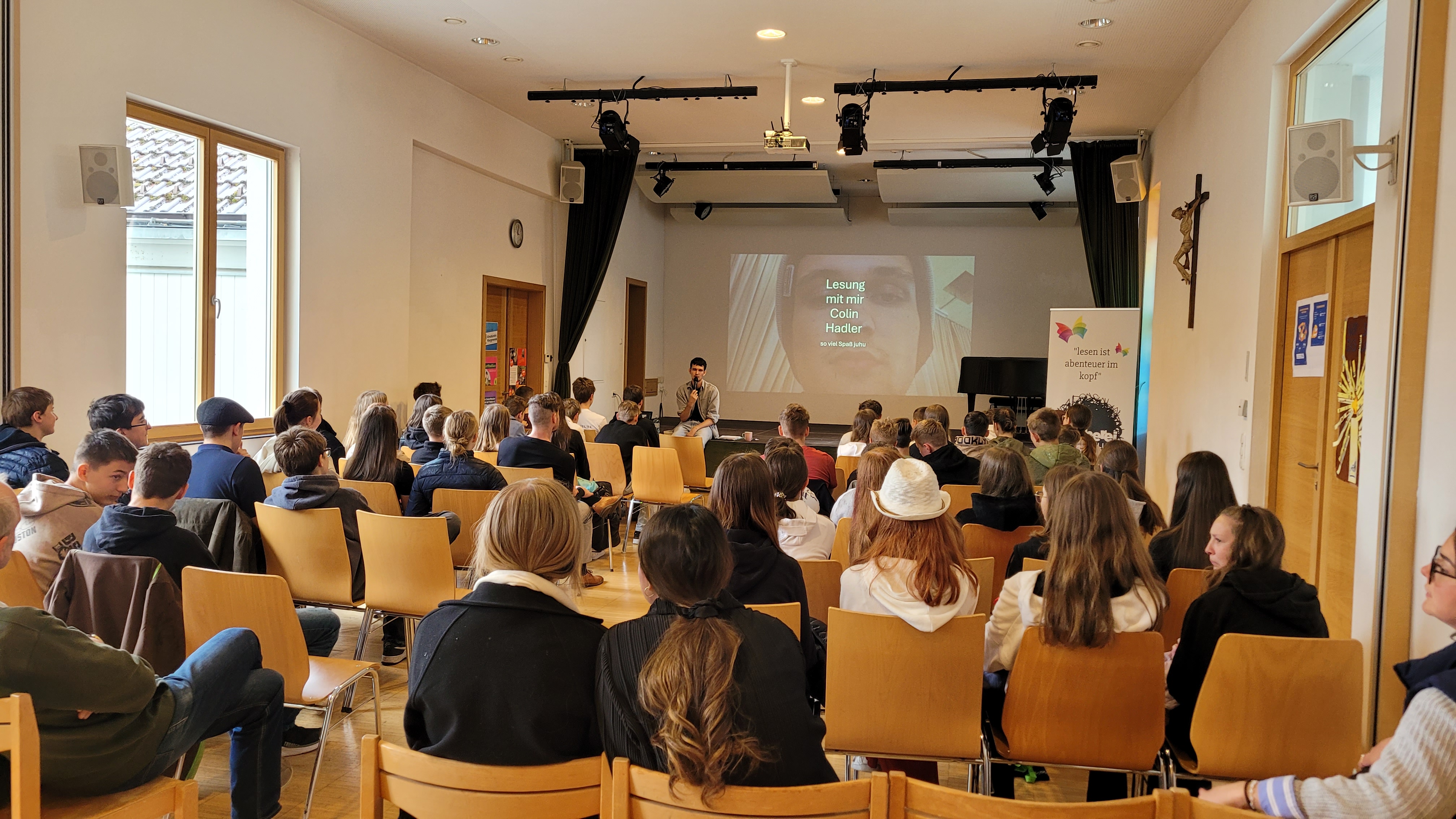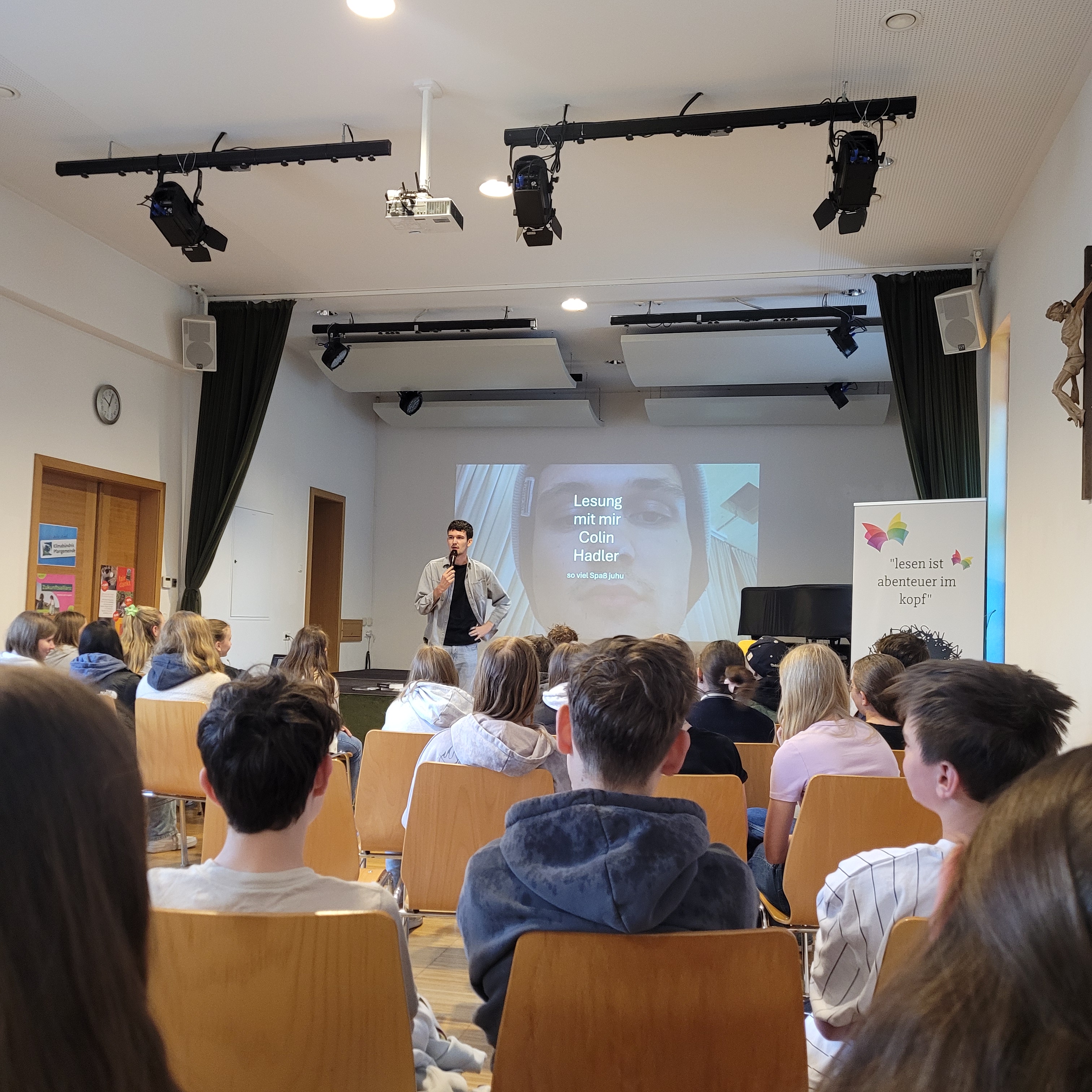 Gleich zu Beginn unseres Lesungstages (die Lange Nacht der Biblioötheken finden naturgemäß dann erst abends statt) durften wir einen echten Profi begrüßen: Colin Hadler! Der bekannte Jugendbuchautor las – oder besser gesagt performte – für die rund 120 Schüler:innen der 3. und 4. Klassen der Mittelschule Bad Zell. Mitreißend, schlagfertig und unglaublich witzig brachte er seine neueste Thriller-Story „Seven Ways to Tell a Lie“ auf die Bühne. Dabei geht’s um Deep Fake-Videos, geheime Wahrheiten und so manche schräge Wendung – inklusive indischer Bettwanzen und misslungener Fotos.