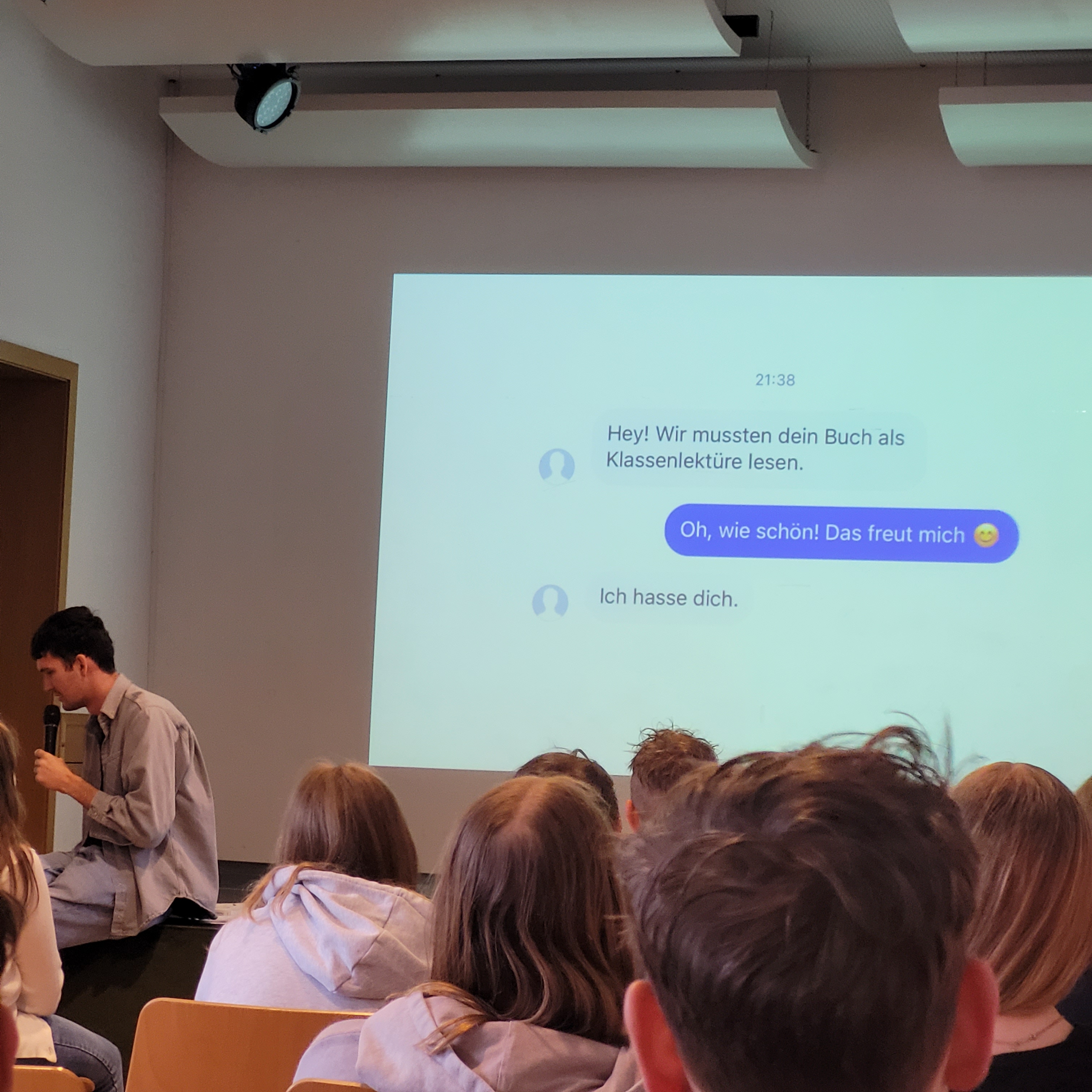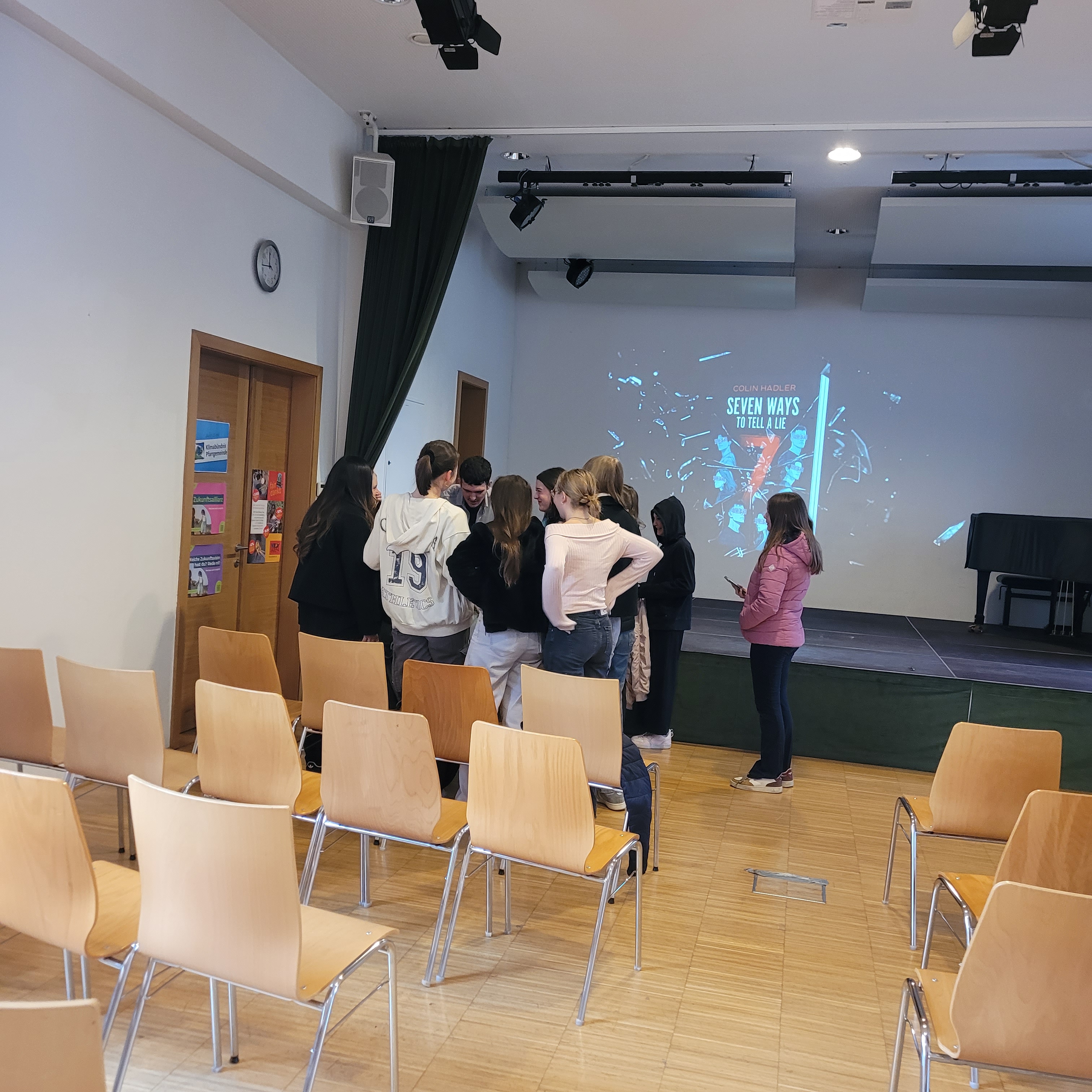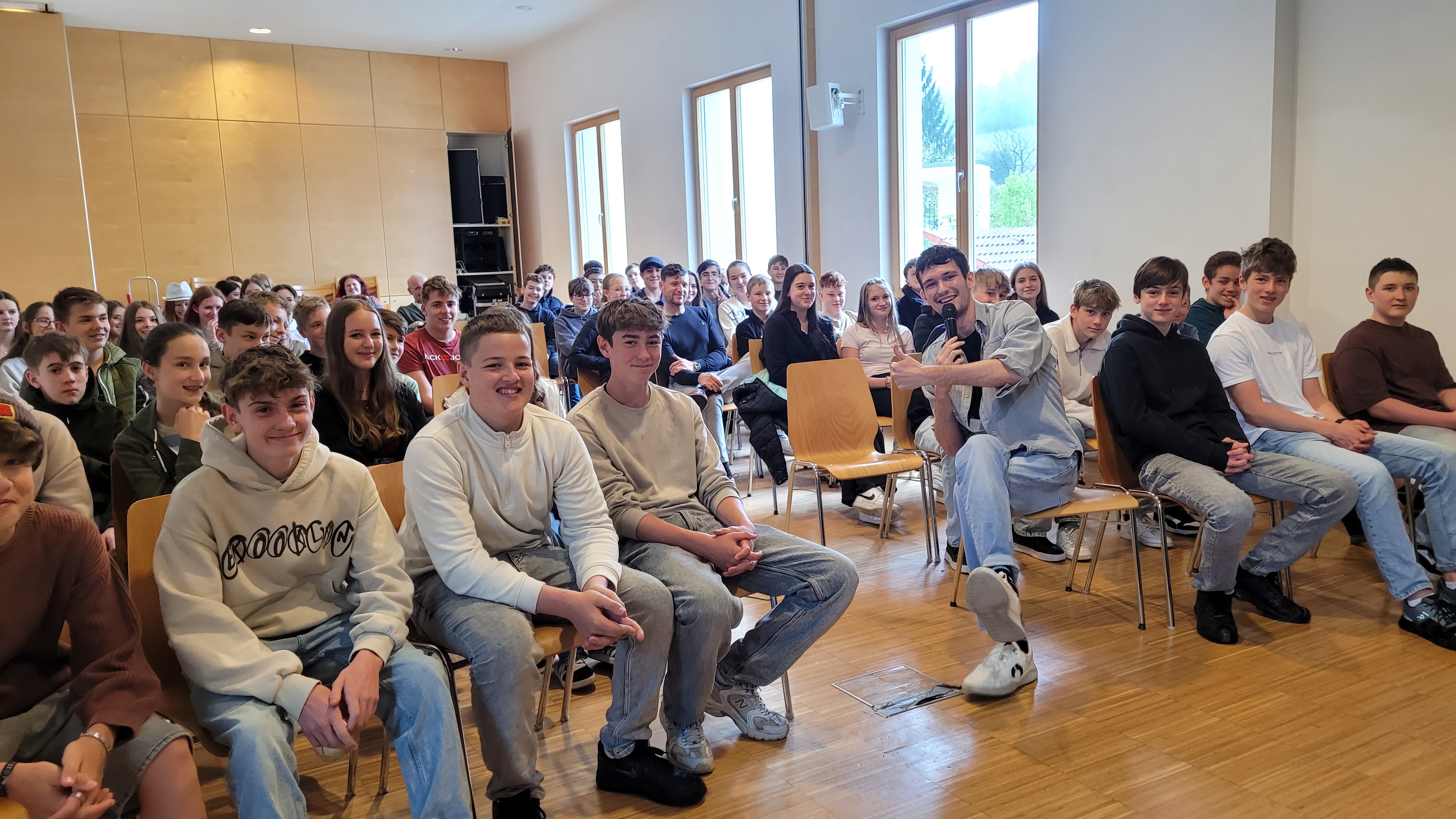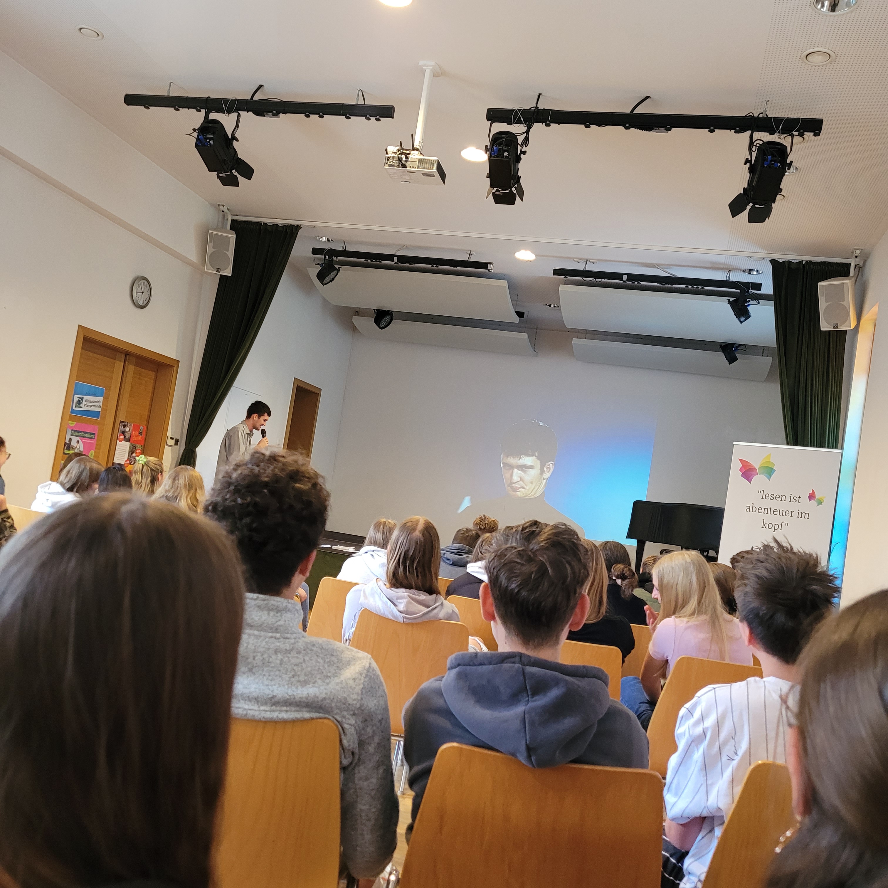 Gleich zu Beginn unseres Lesungstages (die Lange Nacht der Biblioötheken finden naturgemäß dann erst abends statt) durften wir einen echten Profi begrüßen: Colin Hadler! Der bekannte Jugendbuchautor las – oder besser gesagt performte – für die rund 120 Schüler:innen der 3. und 4. Klassen der Mittelschule Bad Zell. Mitreißend, schlagfertig und unglaublich witzig brachte er seine neueste Thriller-Story „Seven Ways to Tell a Lie“ auf die Bühne. Dabei geht’s um Deep Fake-Videos, geheime Wahrheiten und so manche schräge Wendung – inklusive indischer Bettwanzen und misslungener Fotos.