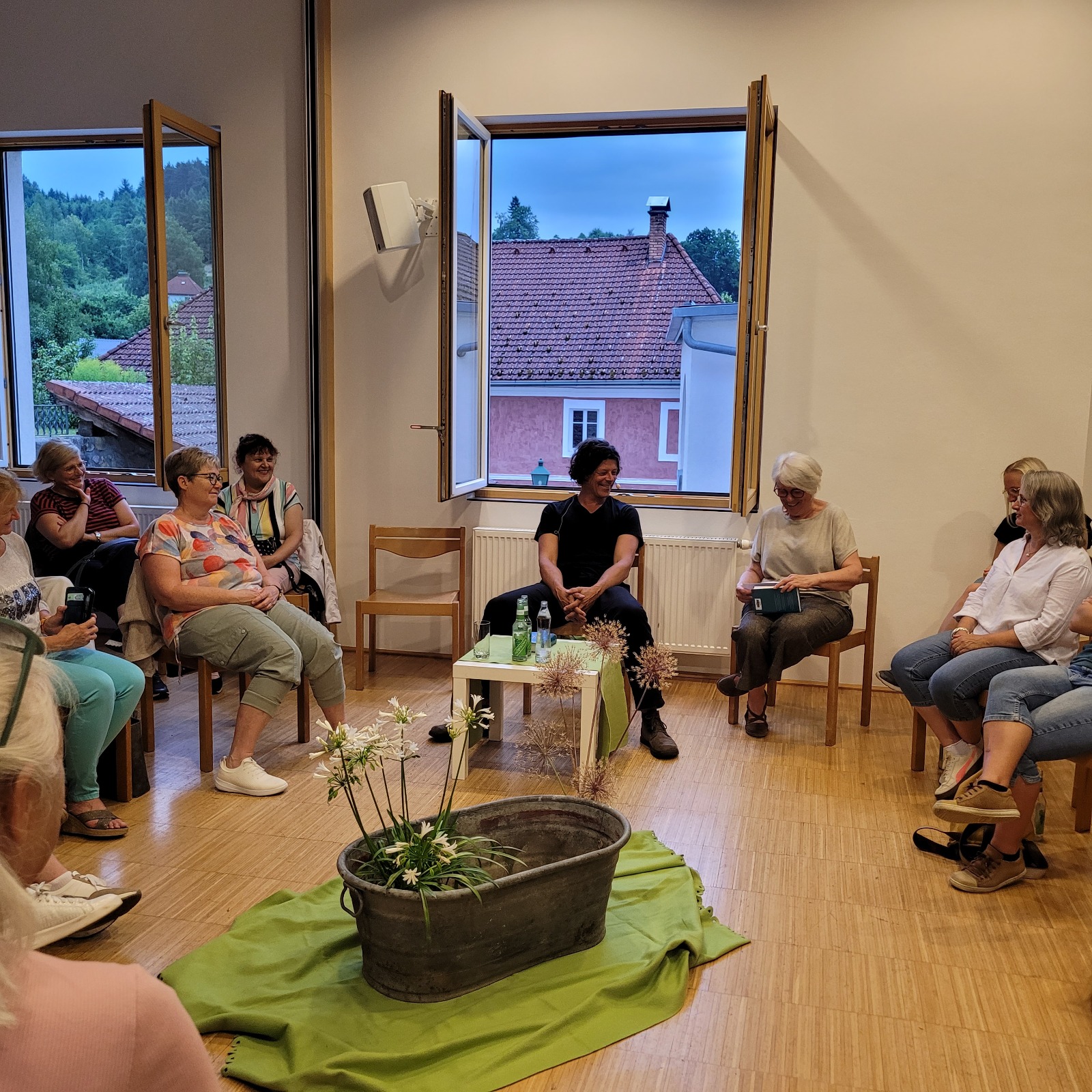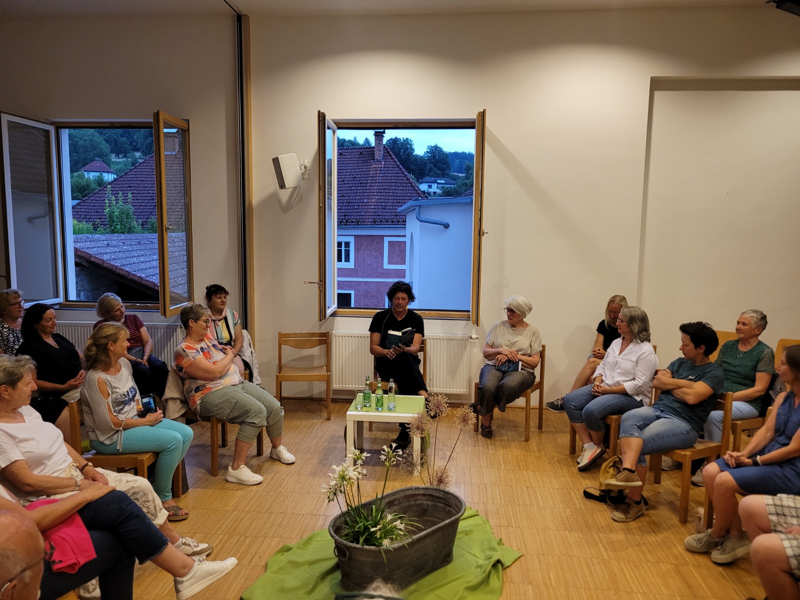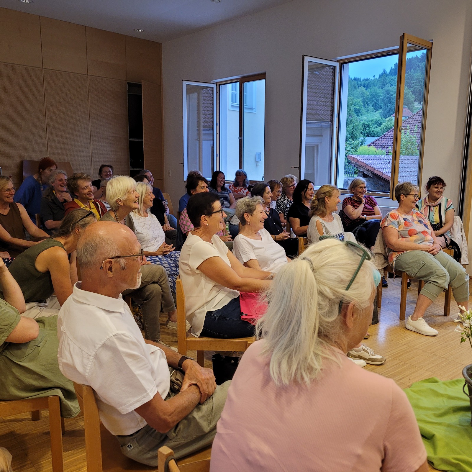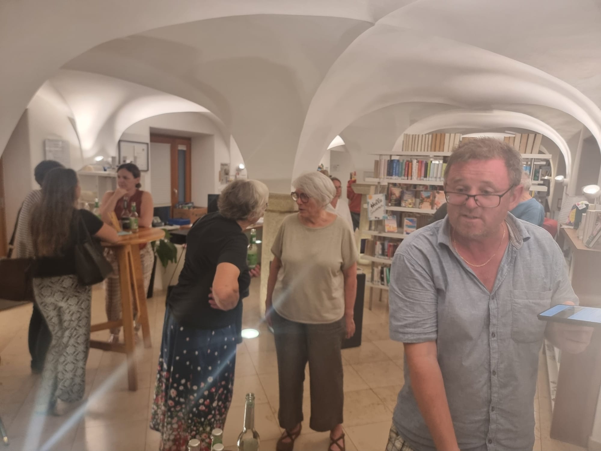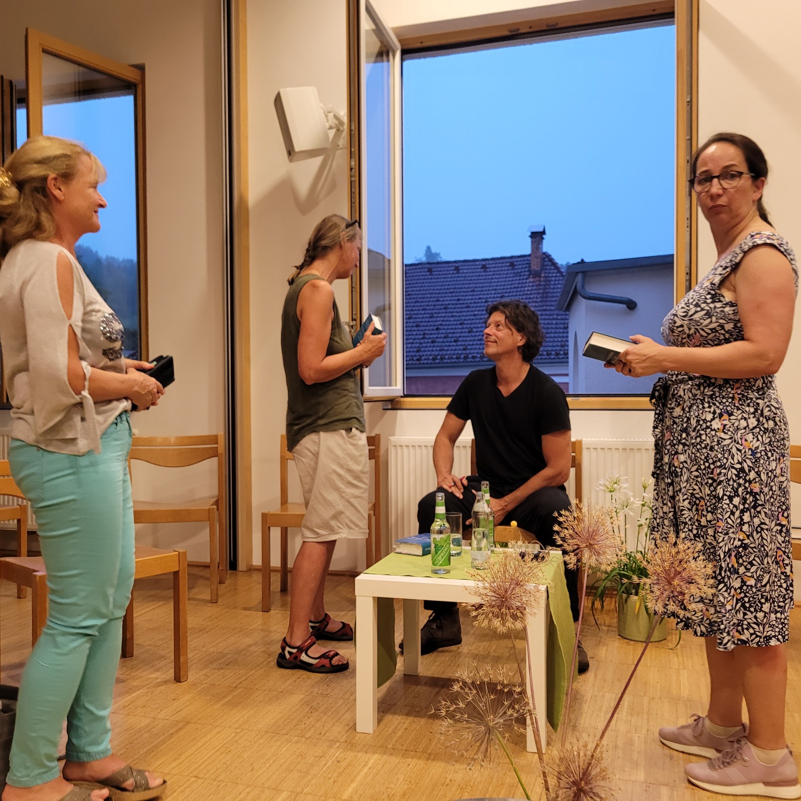 Ursprünglich war eine stimmungsvolle Lesung am Badeteich geplant – doch das Wetter machte uns einen Strich durch die Rechnung. Doch wer dachte, der Abend sei damit ins Wasser gefallen, irrte gewaltig! Über 50 Gäste, teils von weit her angereist, fanden sich kurzerhand im Pfarrsaal ein. Bei tropischen Temperaturen und kühlen Getränken lauschten wir Thomas Sautners Worten, während draußen der Regen prasselte, Gewittergrollen zu hören war und Blitze die Szene dramatisch beleuchteten.