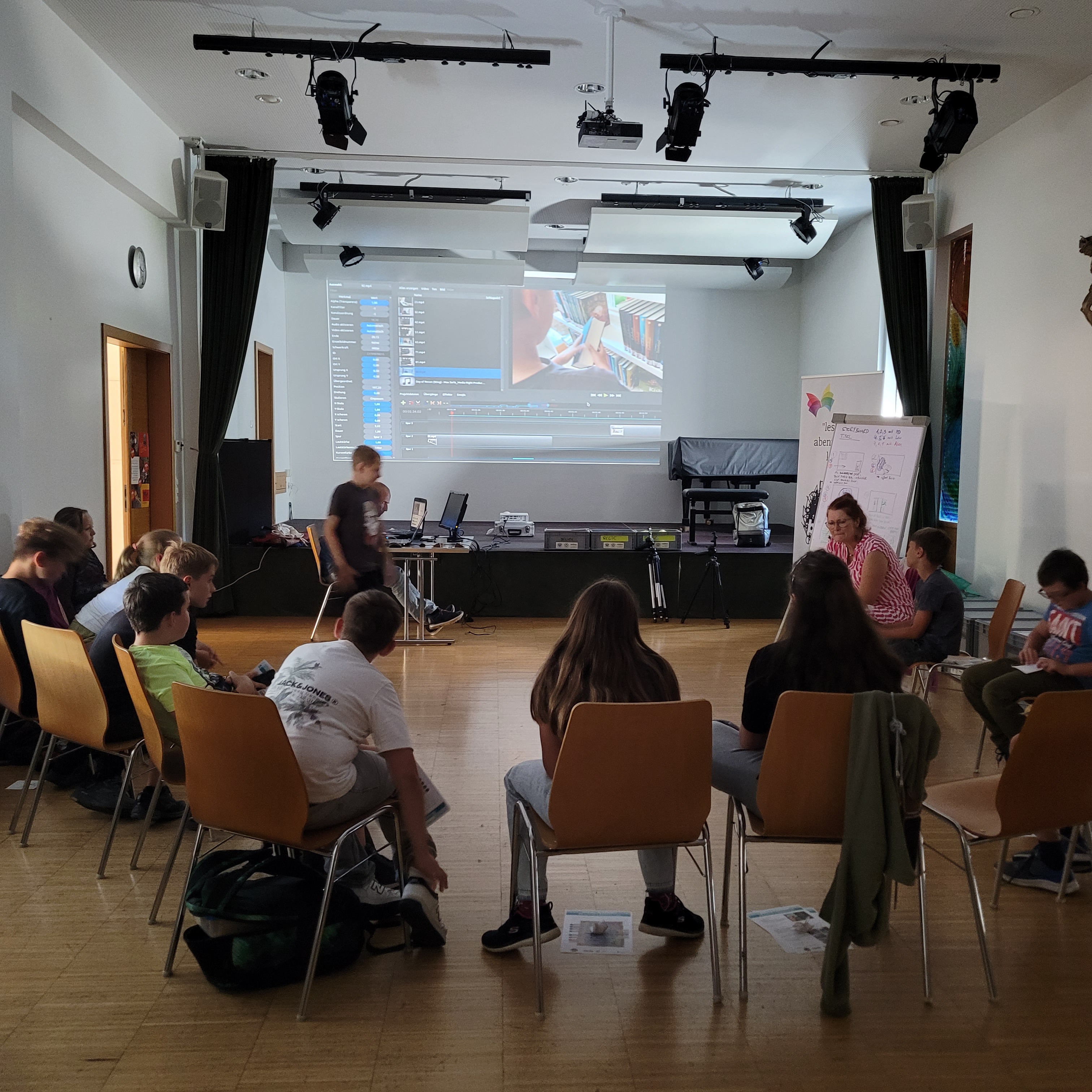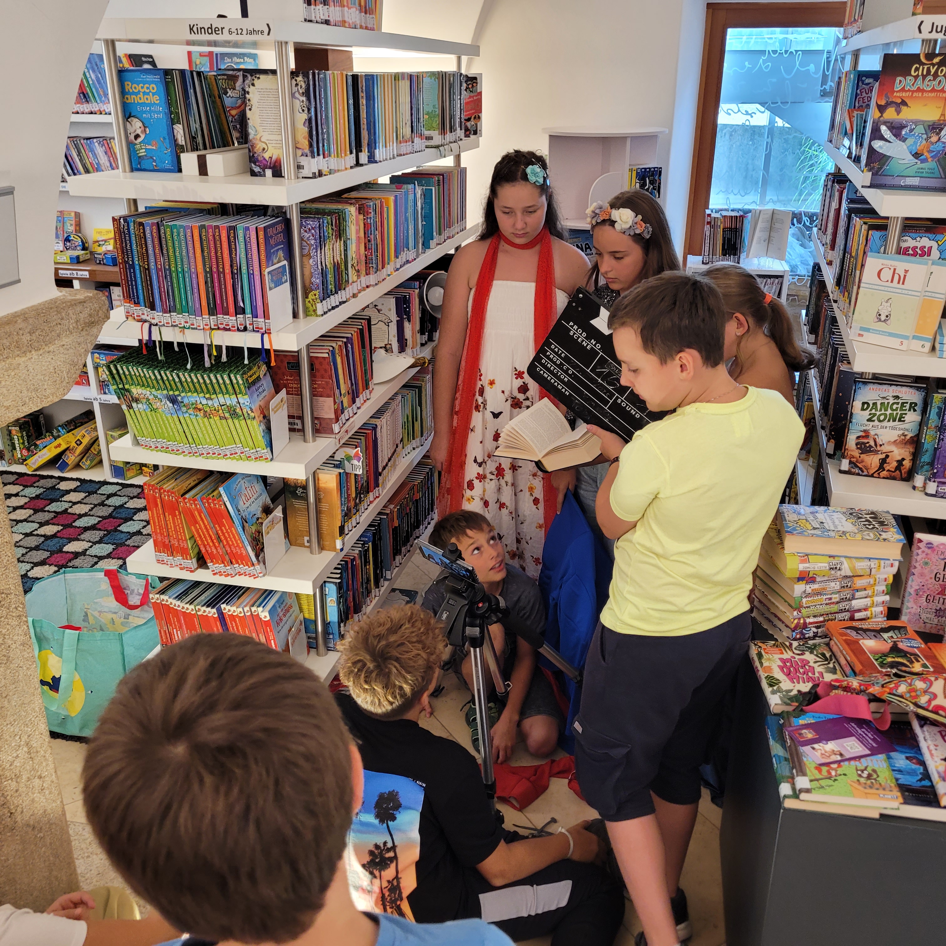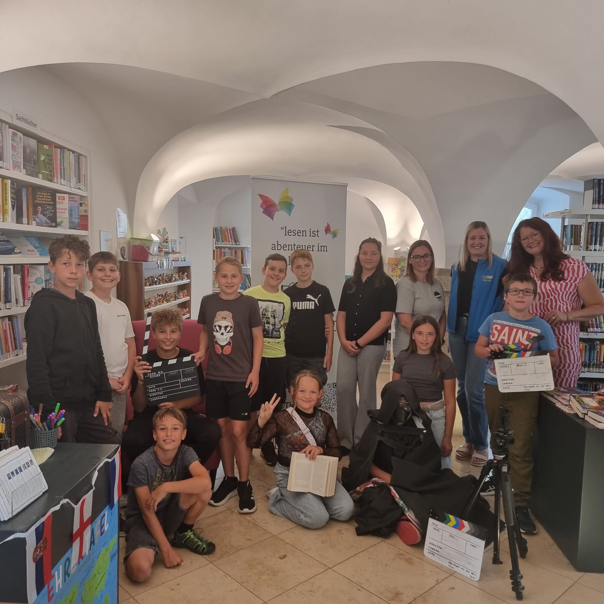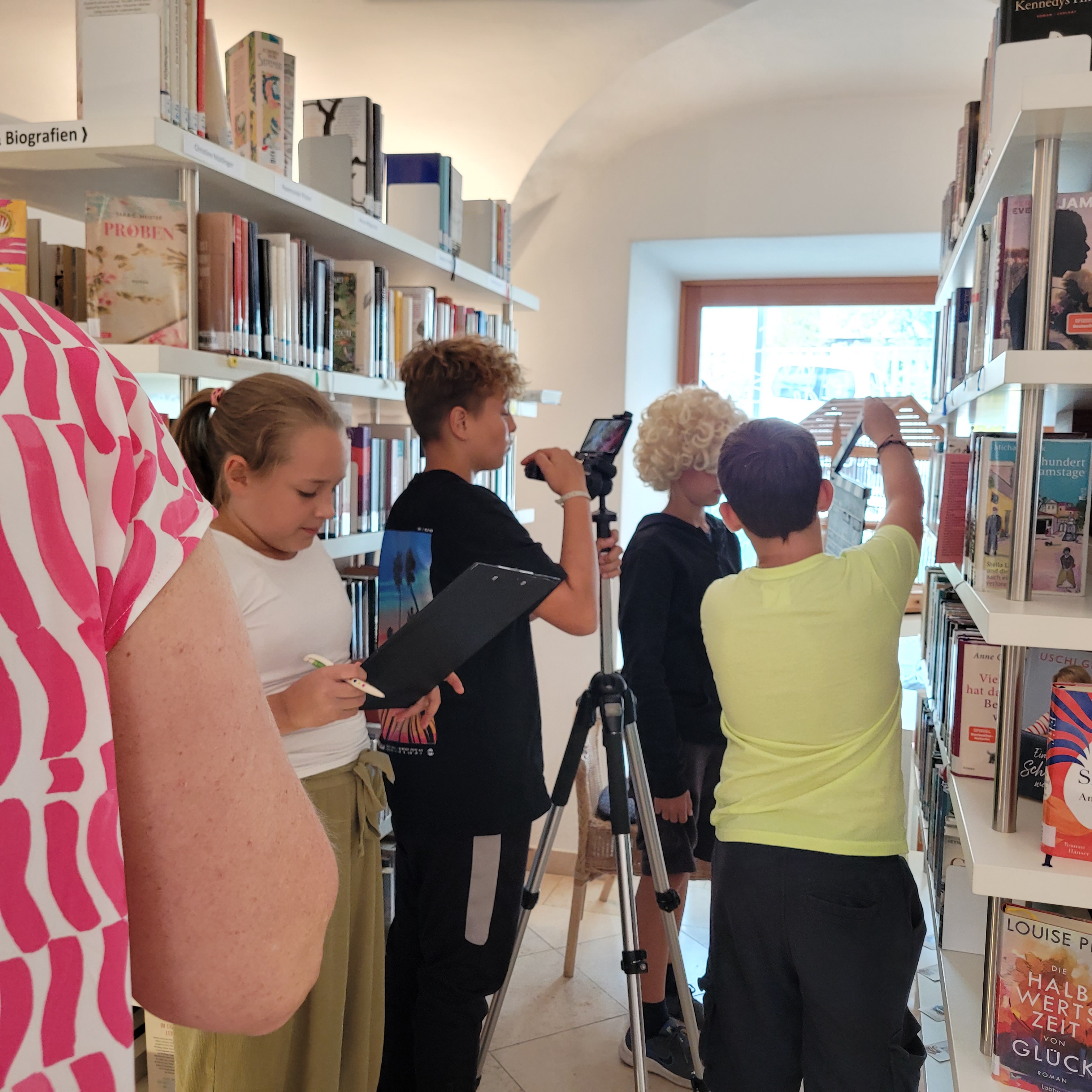 Der Vormittag stand im Zeichen der Theorie und der gemeinsamen Story-Entwicklung. Nach einer Pizza-Pause ging es ans Set – ganze 18 Szenen wurden mit viel Engagement gedreht. Da herrschte kreatives Chaos in der Bücherei – richtig schön war das!