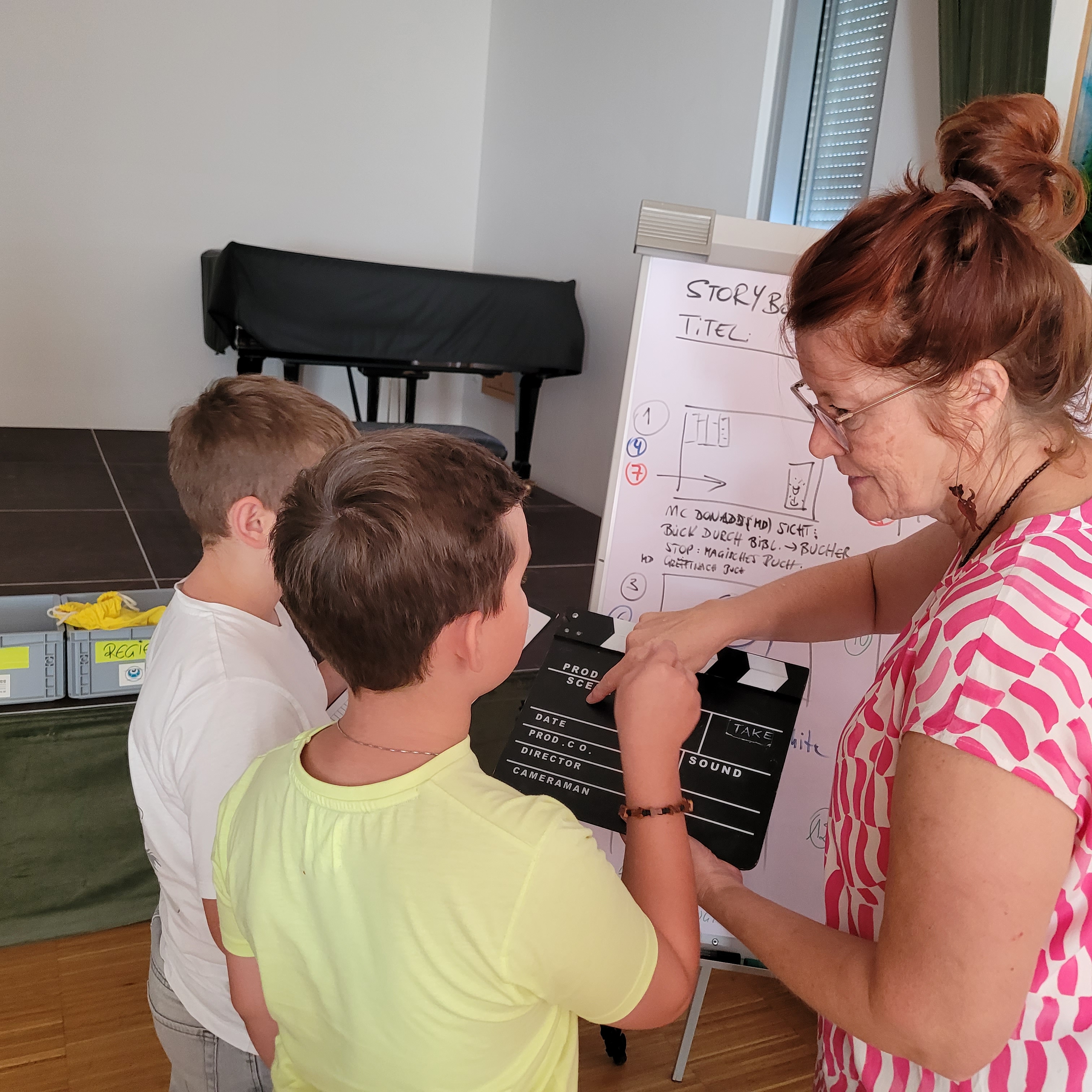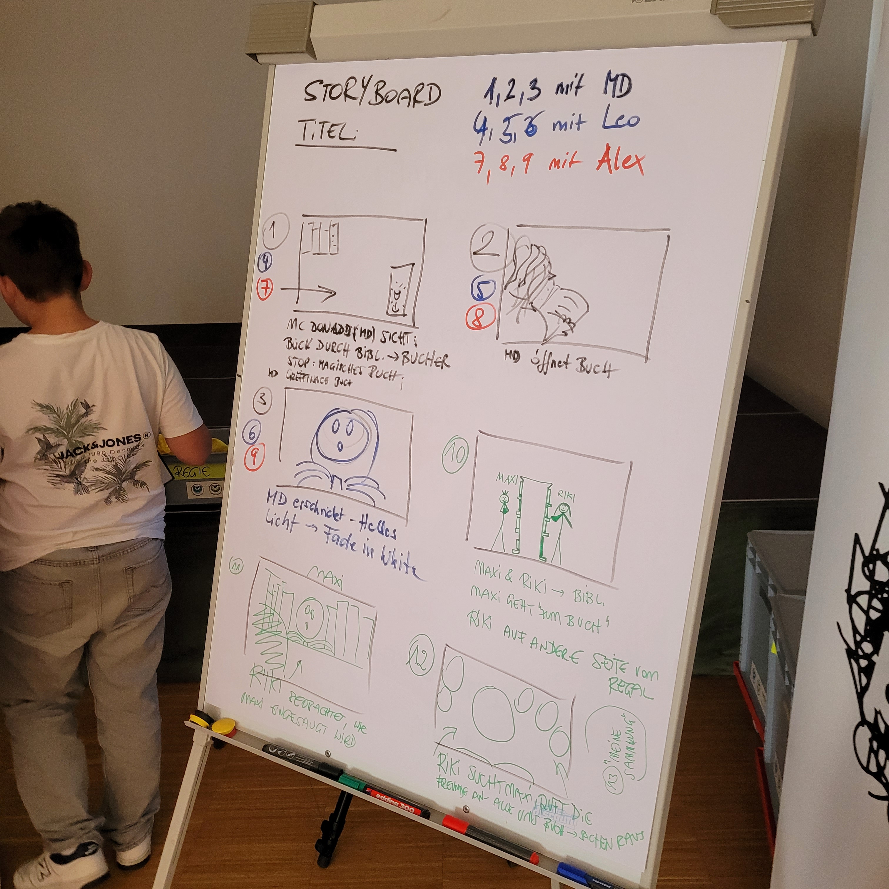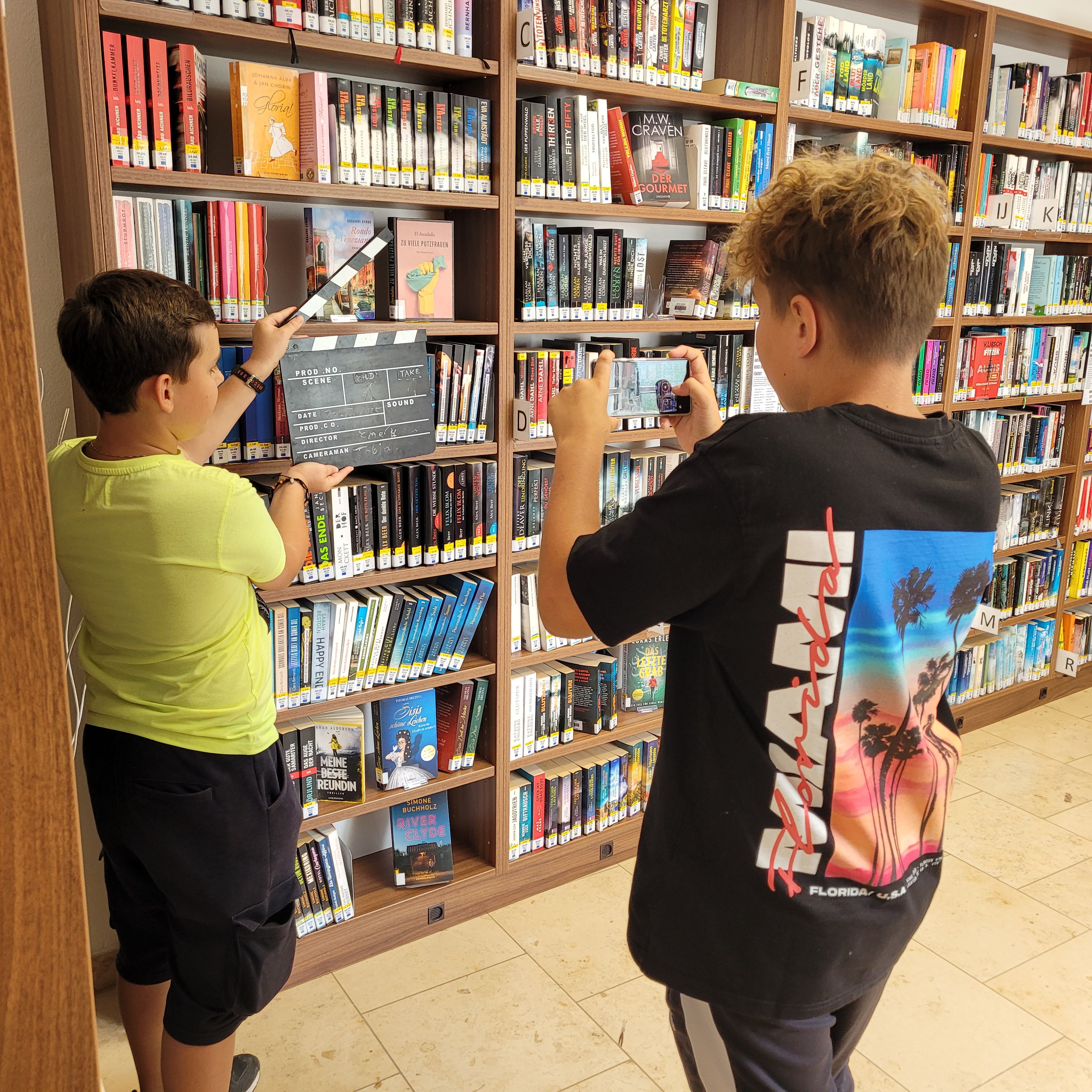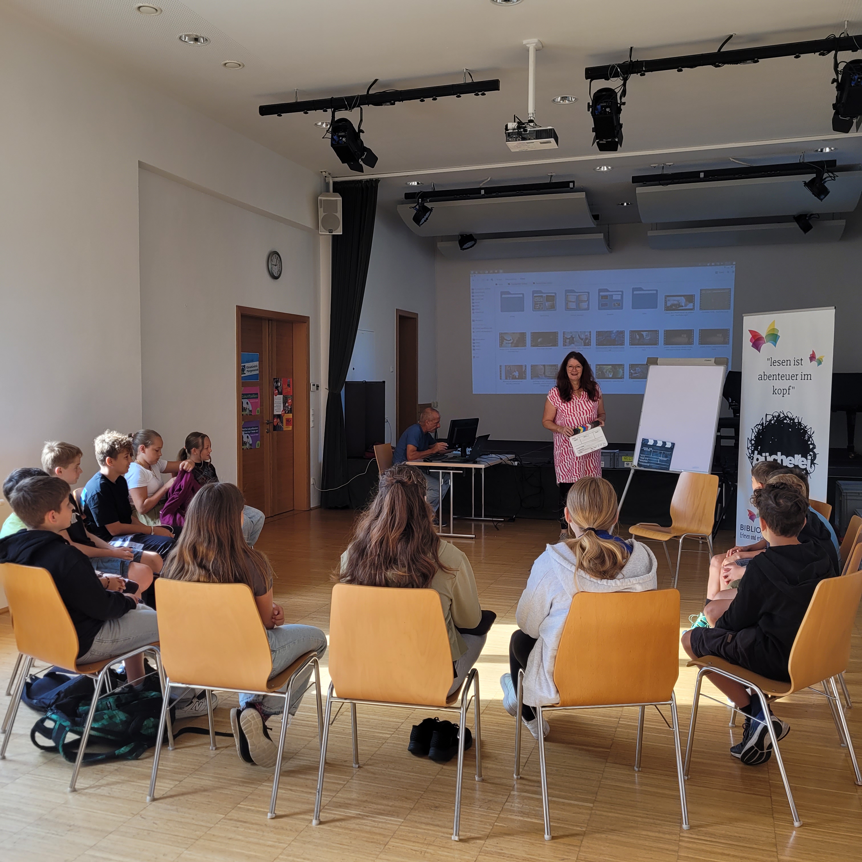 Der Vormittag stand im Zeichen der Theorie und der gemeinsamen Story-Entwicklung. Nach einer Pizza-Pause ging es ans Set – ganze 18 Szenen wurden mit viel Engagement gedreht. Da herrschte kreatives Chaos in der Bücherei – richtig schön war das!