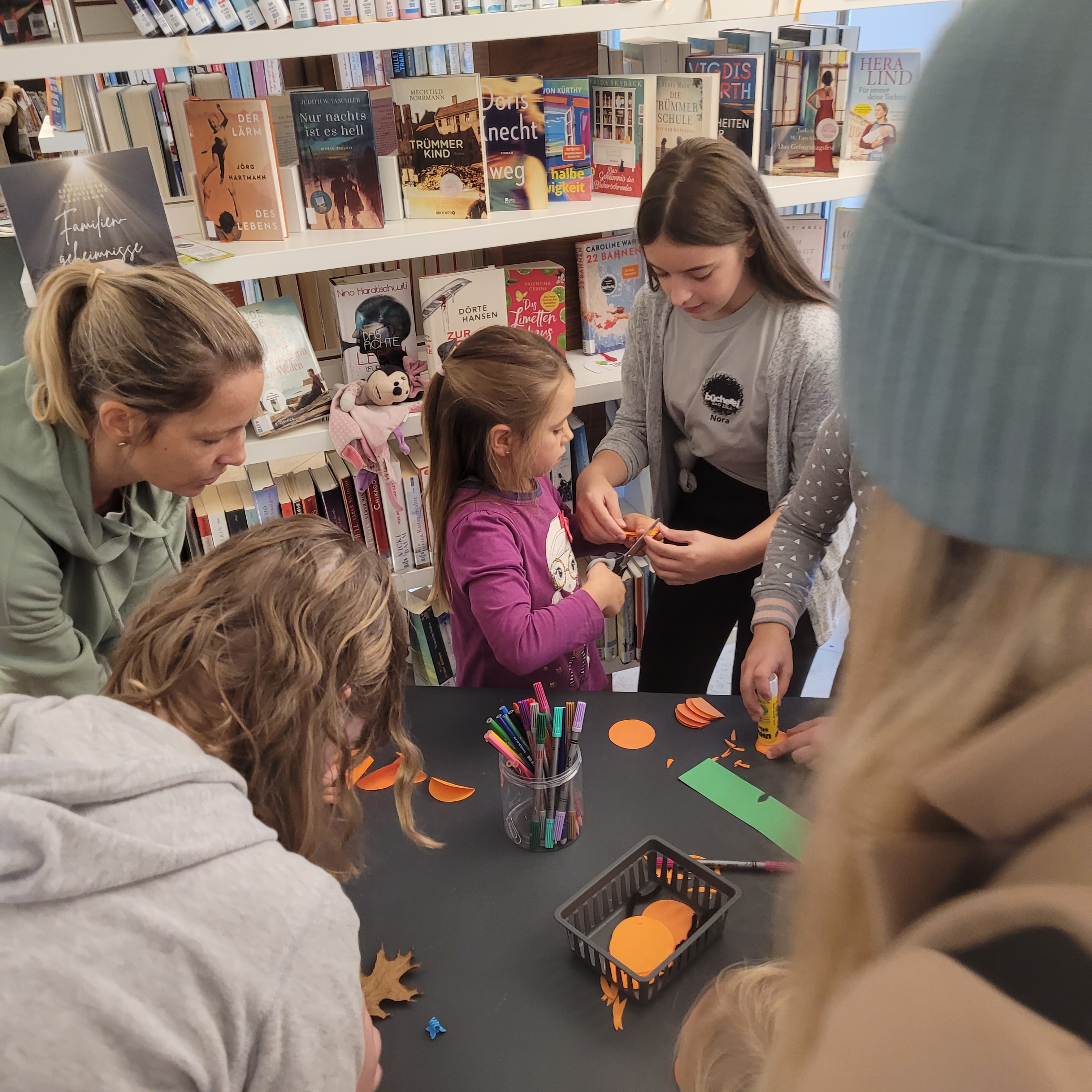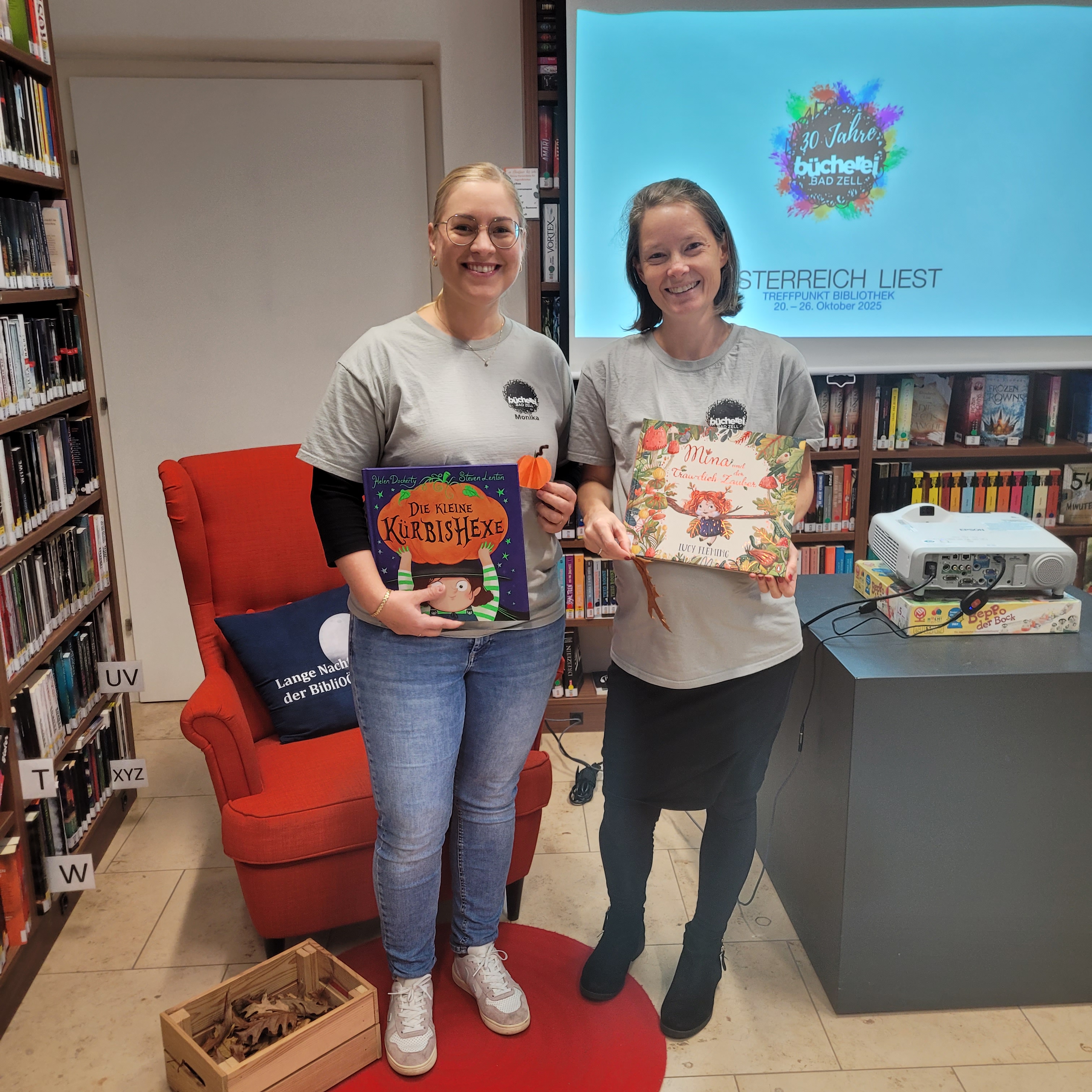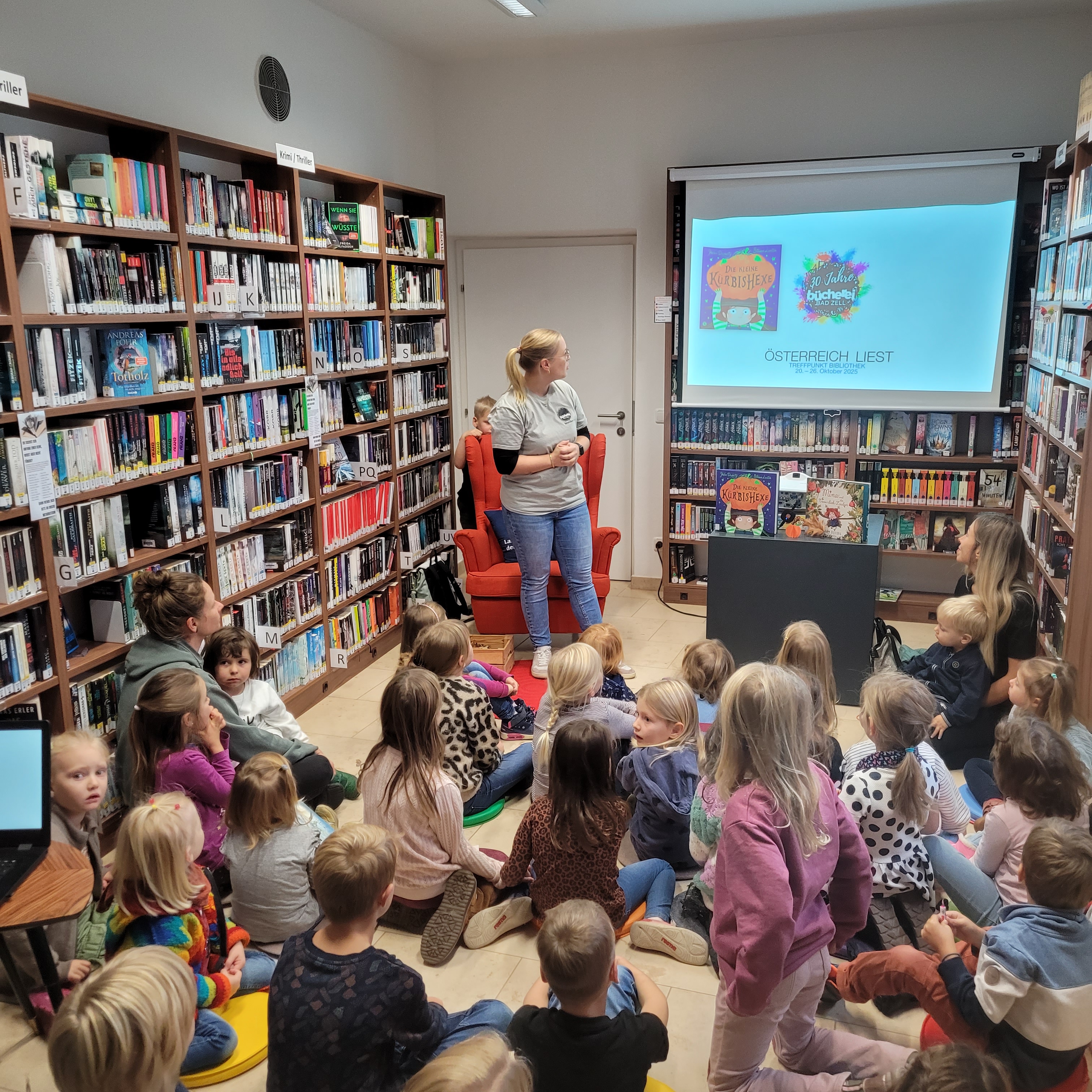 Über 40 Kinder folgten unserer Einladung zum herbstlichen Bilderbuchkino in die Bücherei. Gemeinsam lauschten wir lustigen und spannenden Geschichten über eine Kürbishexe und raschelnde Blätter. Anschließend waren die Basteltische voll in Aktion: Es wurden bunte, herbstliche Lesezeichen gestaltet und kleine Kürbis-Kunstwerke geschaffen. Für eine stärkende Pause sorgten Saft und frische Äpfel, bevor sich alle mit leckeren Kürbiskeksen als Reiseproviant auf den Heimweg machten. Wir freuen uns sehr über diesen schönen Bücherei-Vormittag im Rahmen der Österreich liest – Woche!