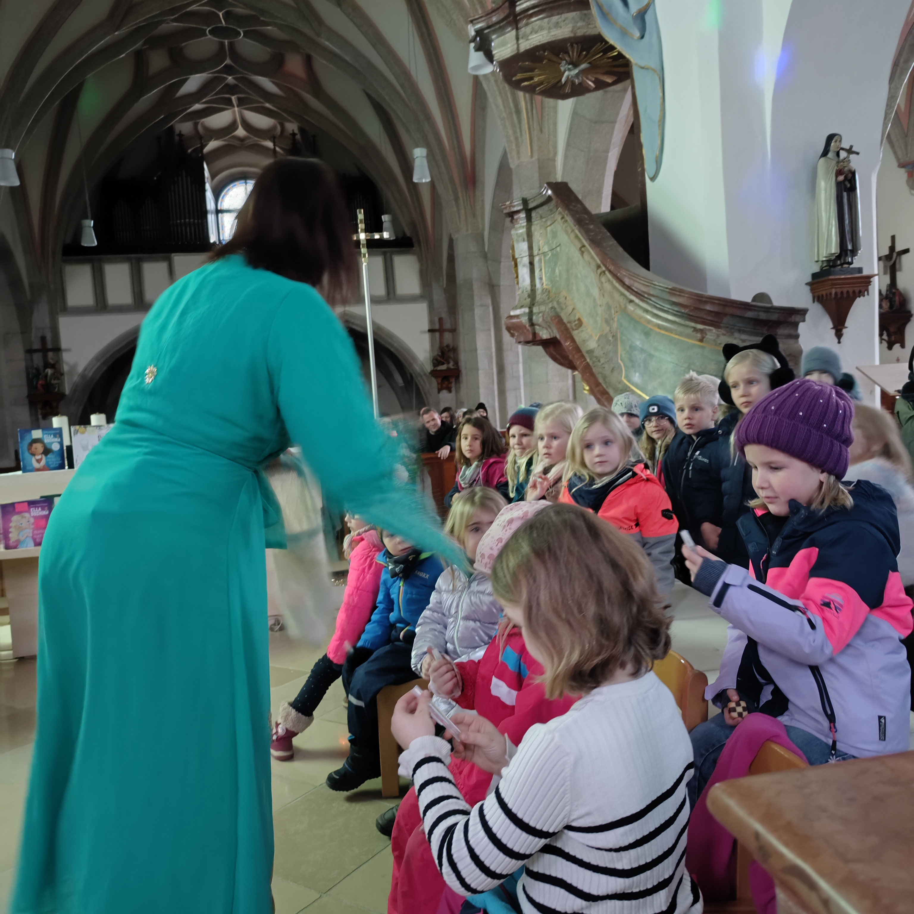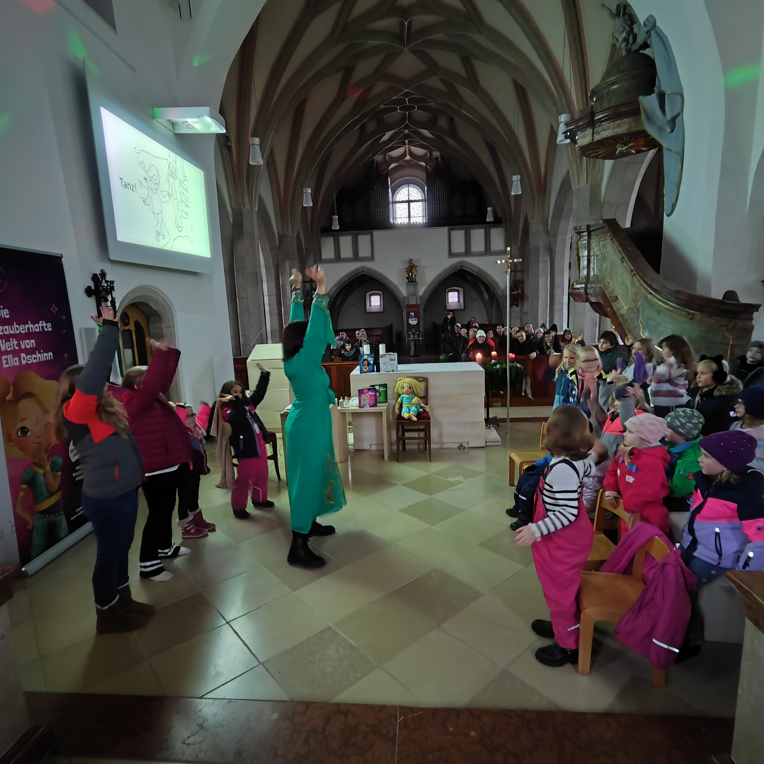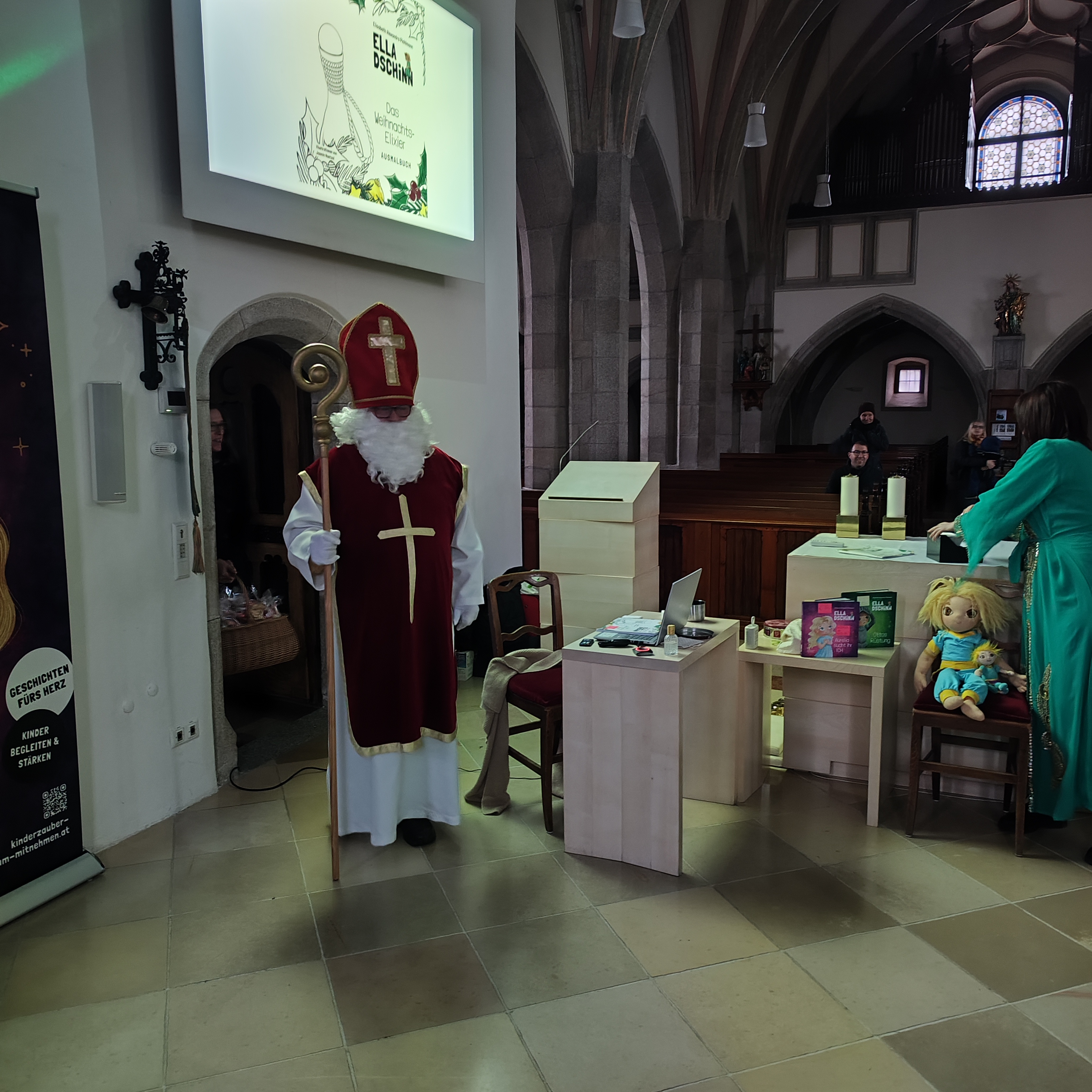 Die weihnachtliche Mitmachlesung mit Ella Dschinn in der Kirche war ein besonders stimmungsvoller Programmpunkt am Adventmarkt. Rund 30 Kinder und über 20 Erwachsene nahmen gemeinsam an der Lesung teil, bei der gelesen, getanzt, geschnuppert, gekostet und geträumt wurde.