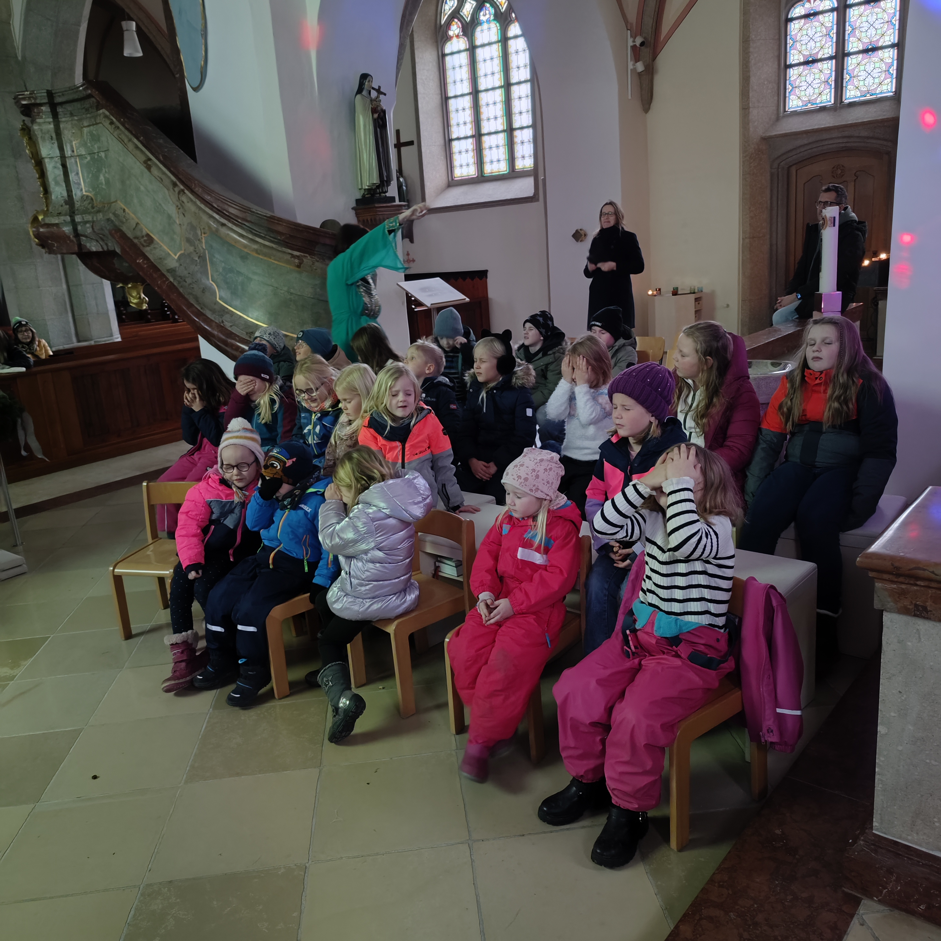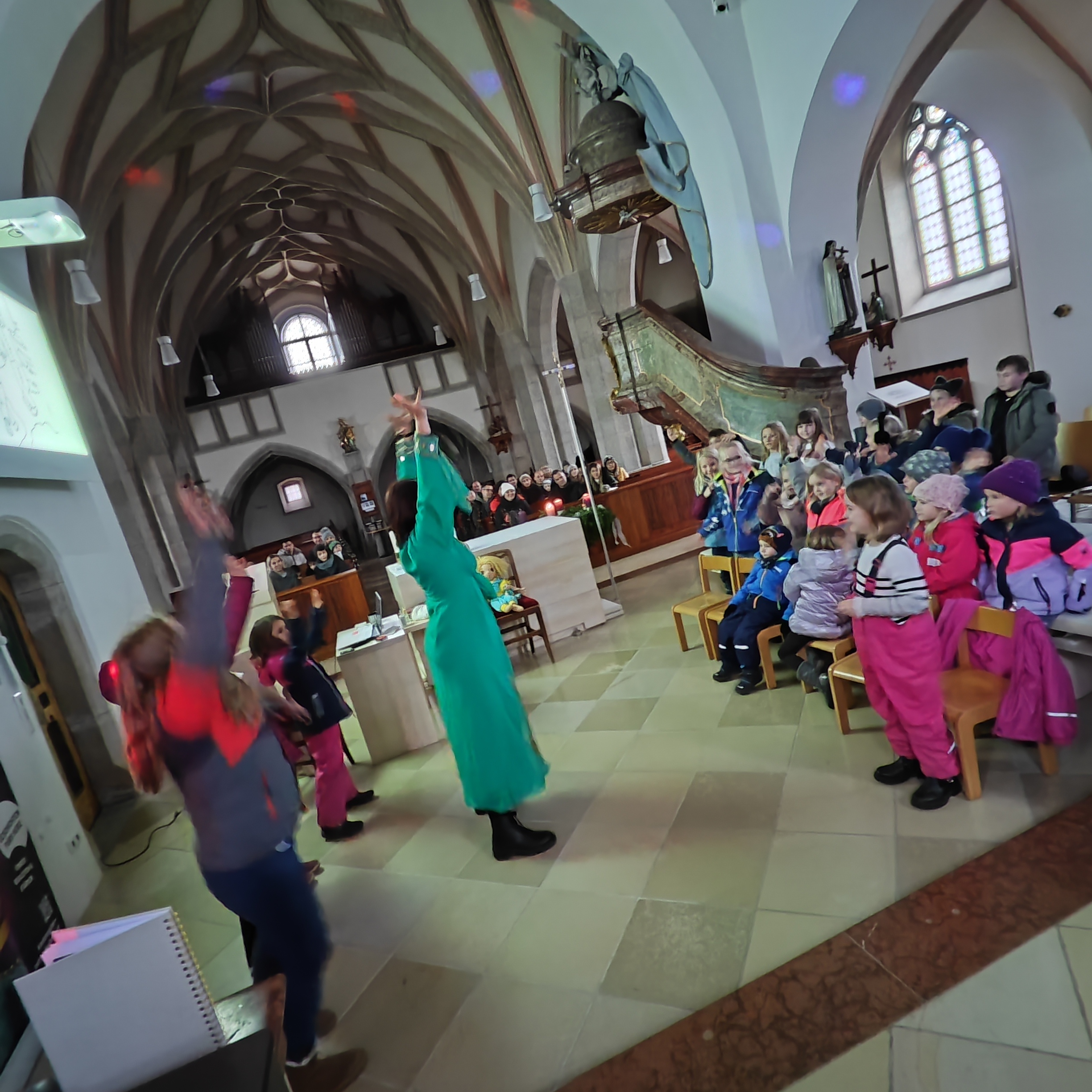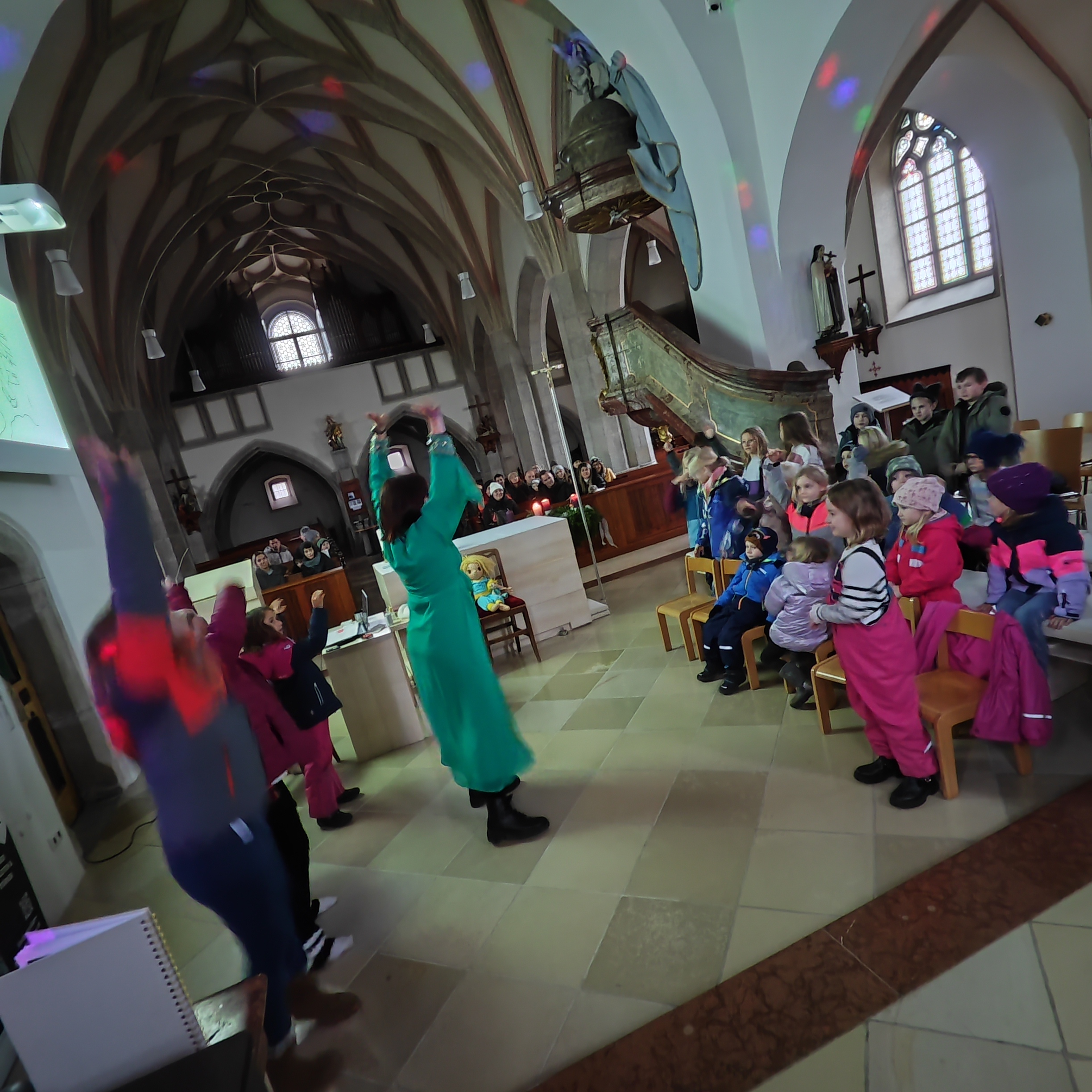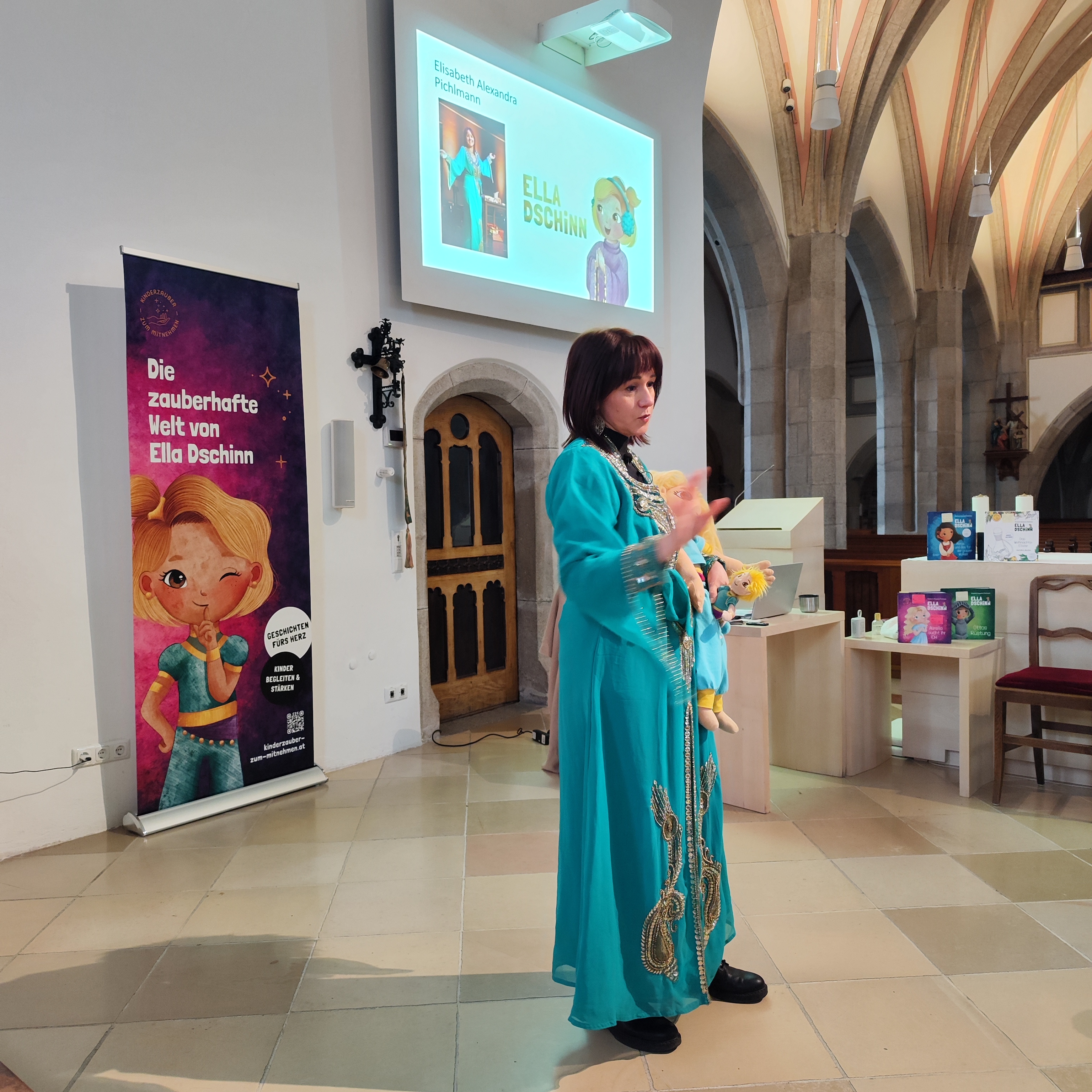 Die weihnachtliche Mitmachlesung mit Ella Dschinn in der Kirche war ein besonders stimmungsvoller Programmpunkt am Adventmarkt. Rund 30 Kinder und über 20 Erwachsene nahmen gemeinsam an der Lesung teil, bei der gelesen, getanzt, geschnuppert, gekostet und geträumt wurde.