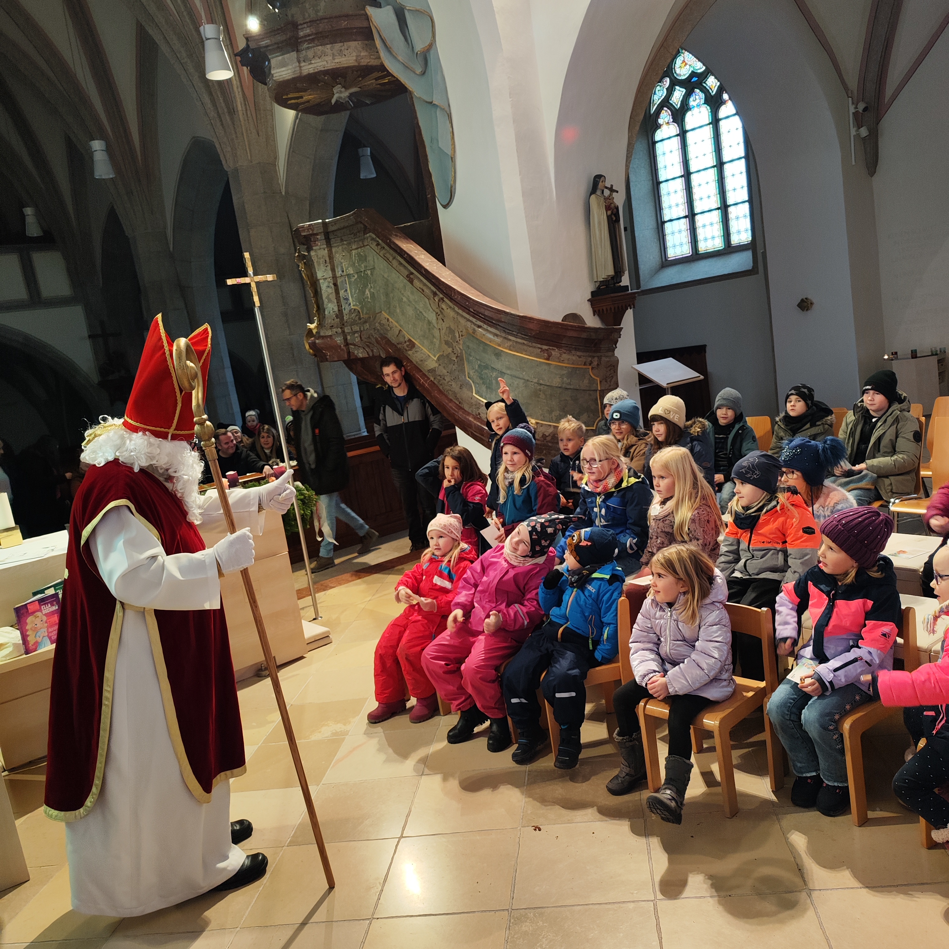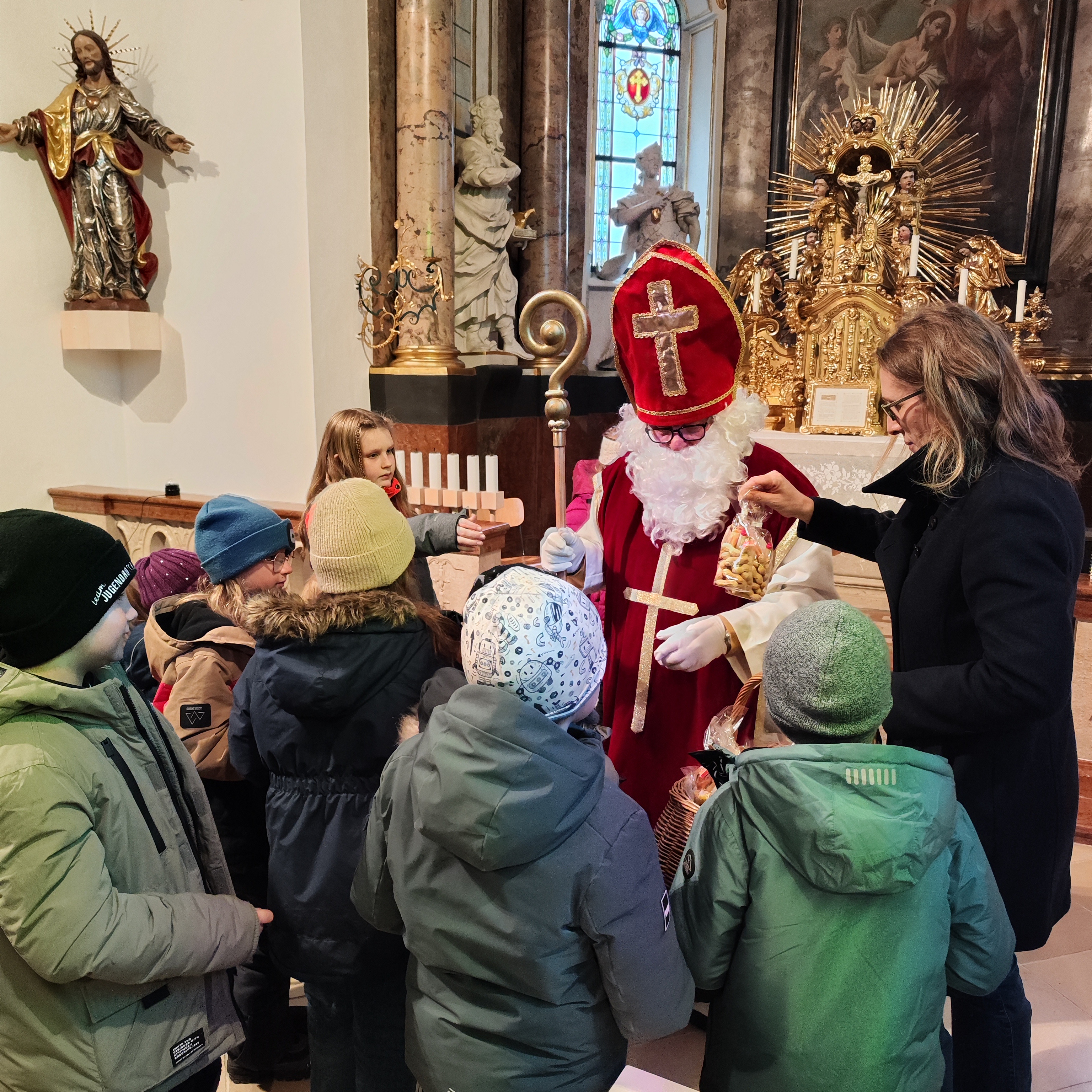 Zum Abschluss erhielten die Kinder kleine Geschenke: eine Sprühflasche mit weihnachtlichem Duft und eine Postkarte. Als schöne Überraschung kam auch der Nikolaus vorbei. Die Kinder stimmten ganz alleine! ein Weihnachtslied an und wurden dafür natürlich mit einem Nikolaussackerl belohnt.