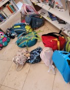 Schulanfänger:innen auf Durchreise in der Bücherei Was aussieht wie ein bunter Rucksack-Haufen mitten im Eingangsbereich, entpuppt sich als Zeichen für Weiterlesen