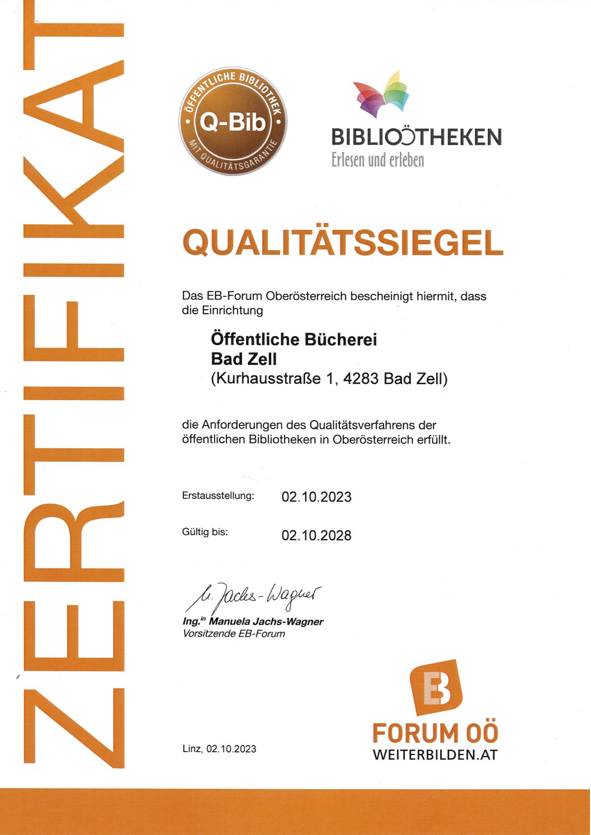 Im Oktober 2023 wurde der Bücherei Bad Zell das Qualitätssiegel für OÖ Bibliotheken verliehen!