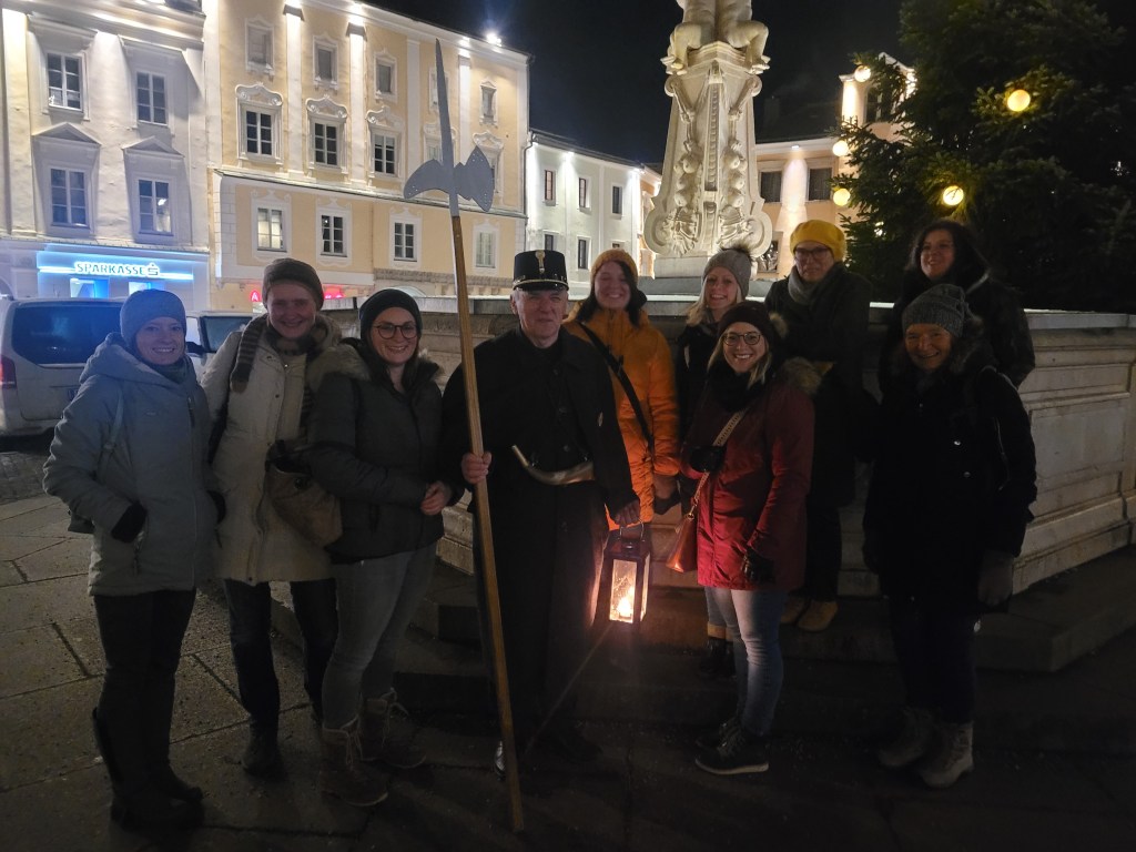 Danach besuchten wir noch den Weihnachtsmarkt, bei dem wir beim stimmungsvollen Ambiente einen Punsch genossen und dann sogar noch die aufwendig verkleideten Perchten trafen. Nicht zur Freude aller Kolleginnen. Nach einem leckerem Essen im Brauhaus, dass endlich einmal Zeit zum besseren Kennenlernen und Plaudern ließ führte uns der Nachtwächter noch durch das bereits im Dunkeln versunkene Freistadt und zeigte uns den ein oder andere bisher unentdeckten Winkel.