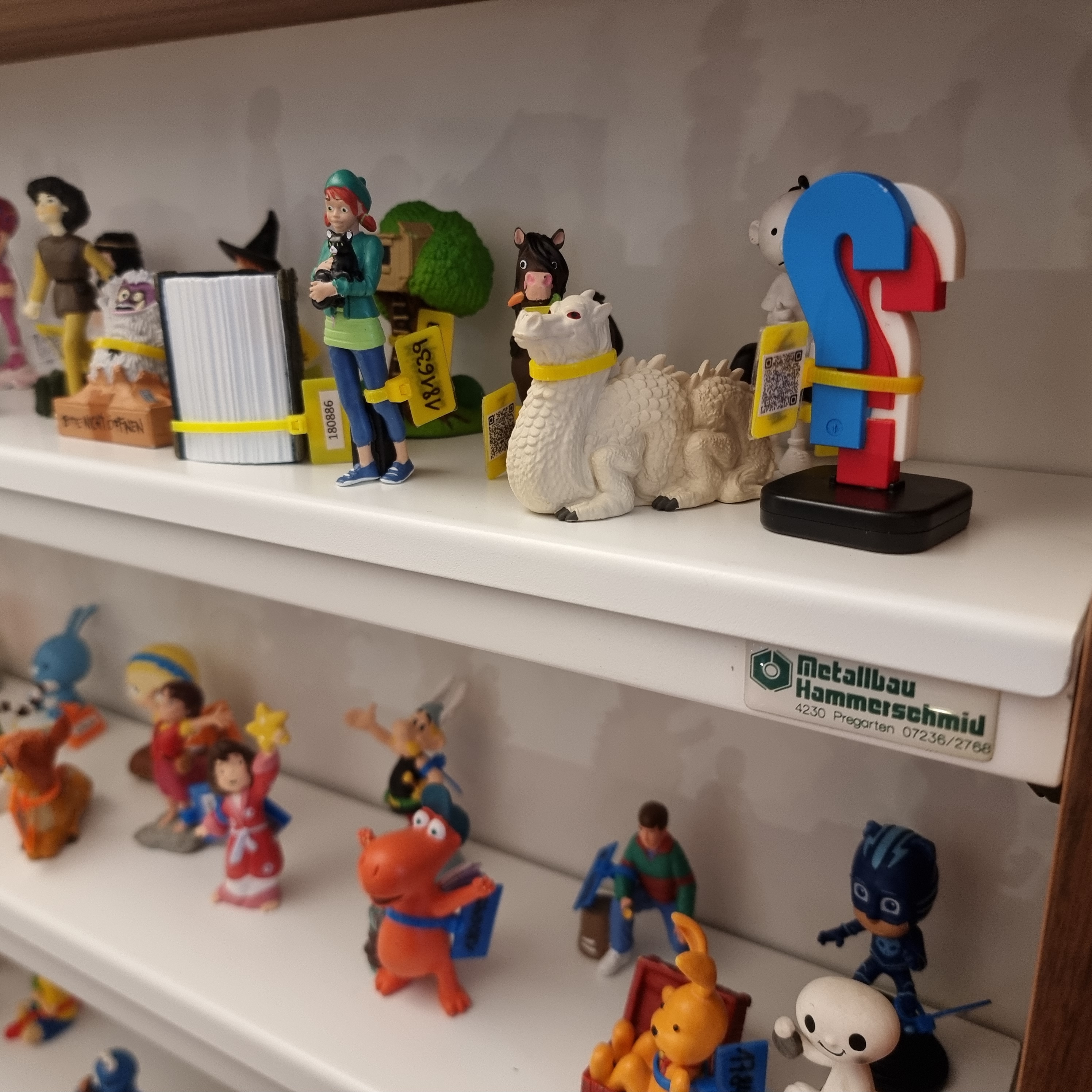 Ab sofort werden unsere Tonies mit kleinen Kabelbindern markiert. Die verschiedenen Farben stehen dabei für das empfohlene Alter. Auf einer Seite des Beschriftungsfeldes befindet sich die Mediennummer, auf der anderen Seite ein QR-Code, über den Eltern die Beschreibung des jeweiligen Tonies abrufen können.