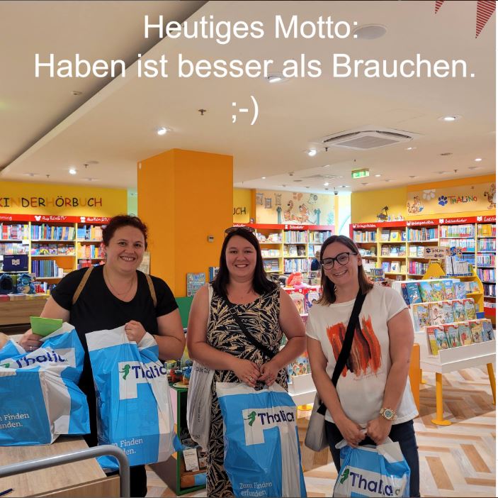Wir waren im Kaufrausch für euch! Heute Vormittag haben wir uns bei Thalia durch die neuesten Titel der Kinder- und Erwachsenenliteratur gestöbert und sind fündig geworden: 52 neue Bücher haben den Weg in unsere Bücherei gefunden! In den nächsten Tagen findet ihr sie in unseren Regalen – freut euch auf spannenden neuen Lesestoff.