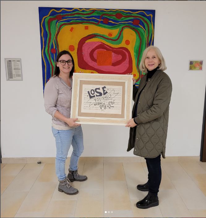 Wie es dazu kam? Wie man so schön sagt: „Durch’s Reden keman d’Leit zam!“ Beim Adventmarkt haben wir Upcycling-Handlettering-Bilder aus alten Bilderrahmen und Buchseiten verkauft. Eine Lehrerin bewunderte unseren Stand und meinte scherzhaft, sie bräuchte den Spruch von einem kleinen Bild in einem größeren Rahmen für den Musikraum.